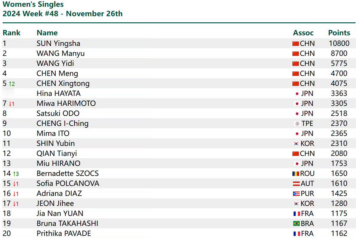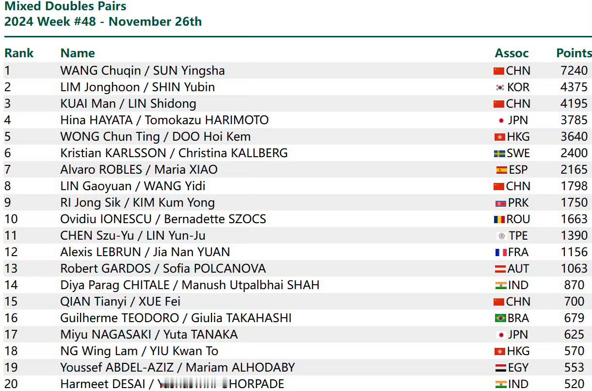 241126 王楚钦孙颖莎国际乒联48周排名存档