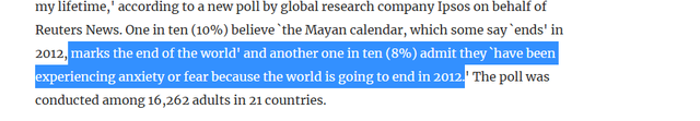 研究公司易普索针对二十一个国家1.6万成年人的调查研究报告显示,这则不知道是不是真的出自于玛雅人的末日预言,至少对全球百分之八的人造成了极大影响。尽管许多国家甚至官方出面澄清奉劝民众不要相信末日谣言,但是人们依旧选择不信,认为高层早有了逃生计划,只是为了不引起骚乱而向民众隐瞒了末日的真相.