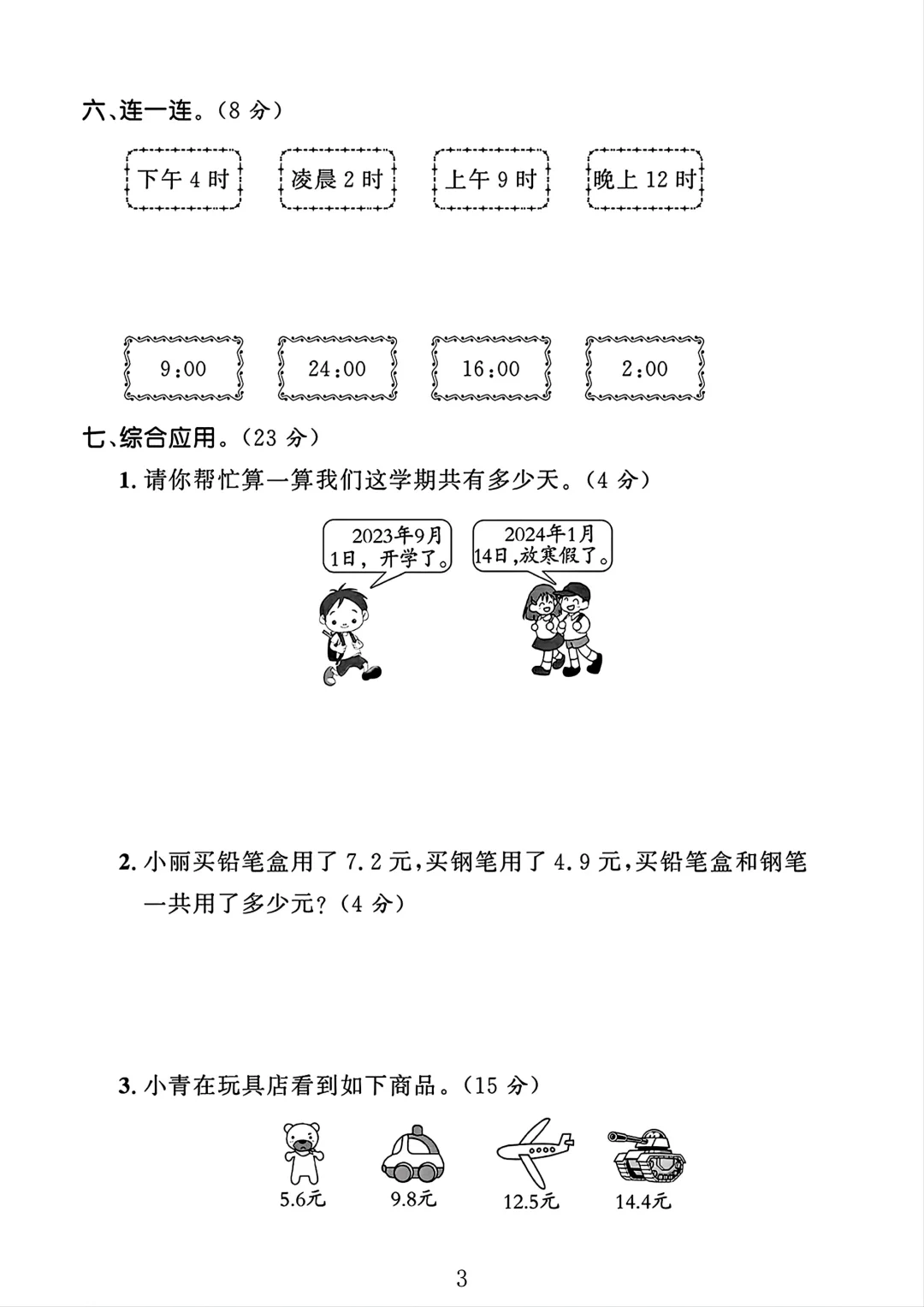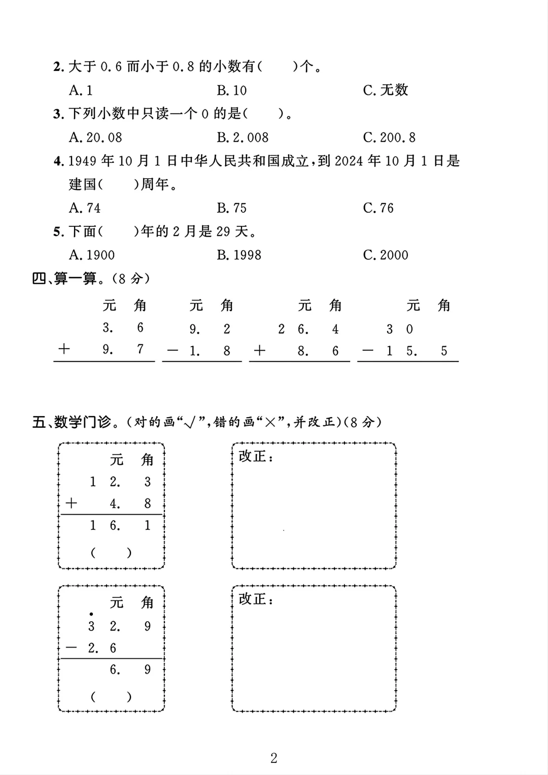 北师大版数学 三年级上册数学 单元测试 试卷 电子版可打印 小学数学