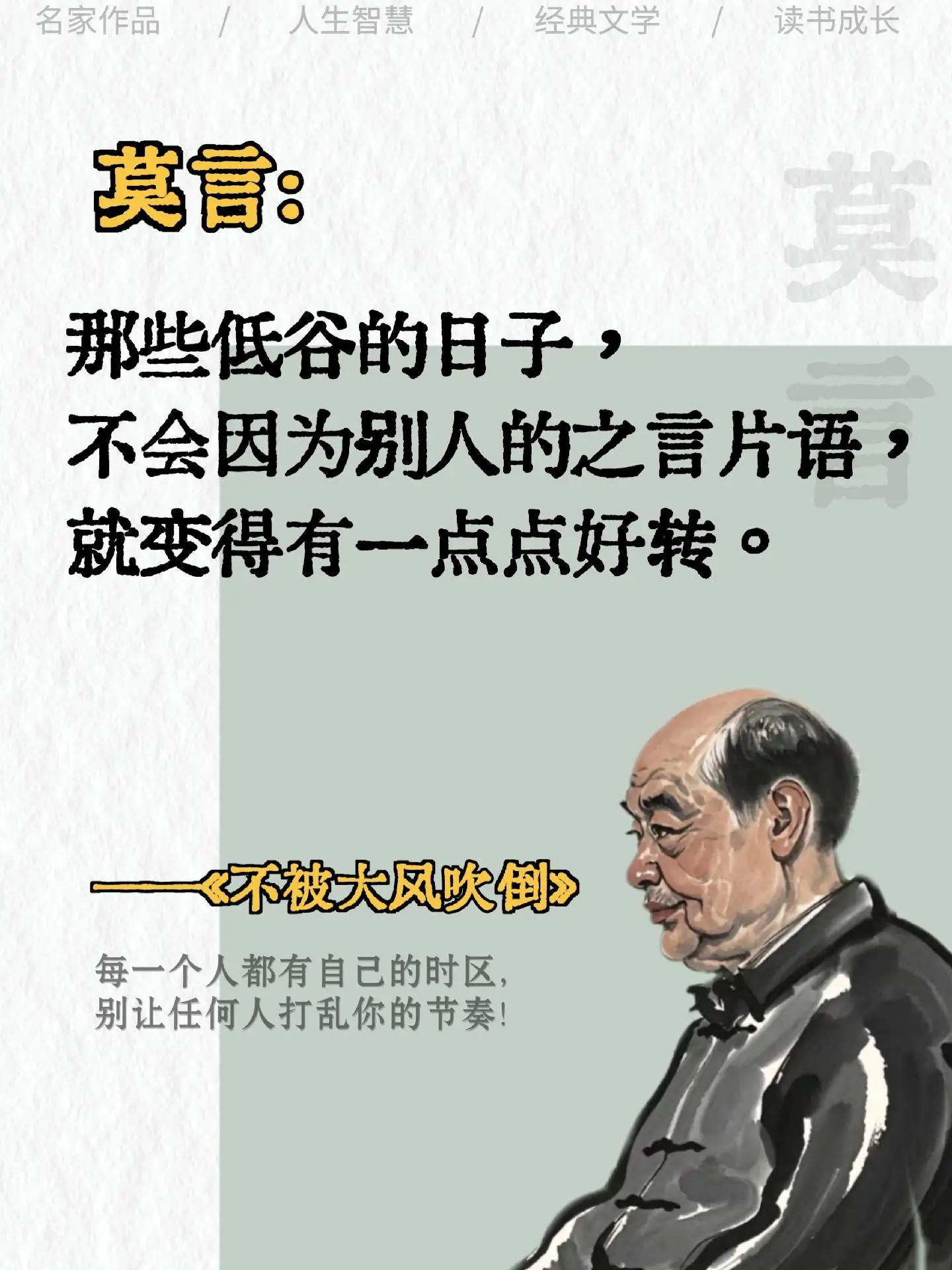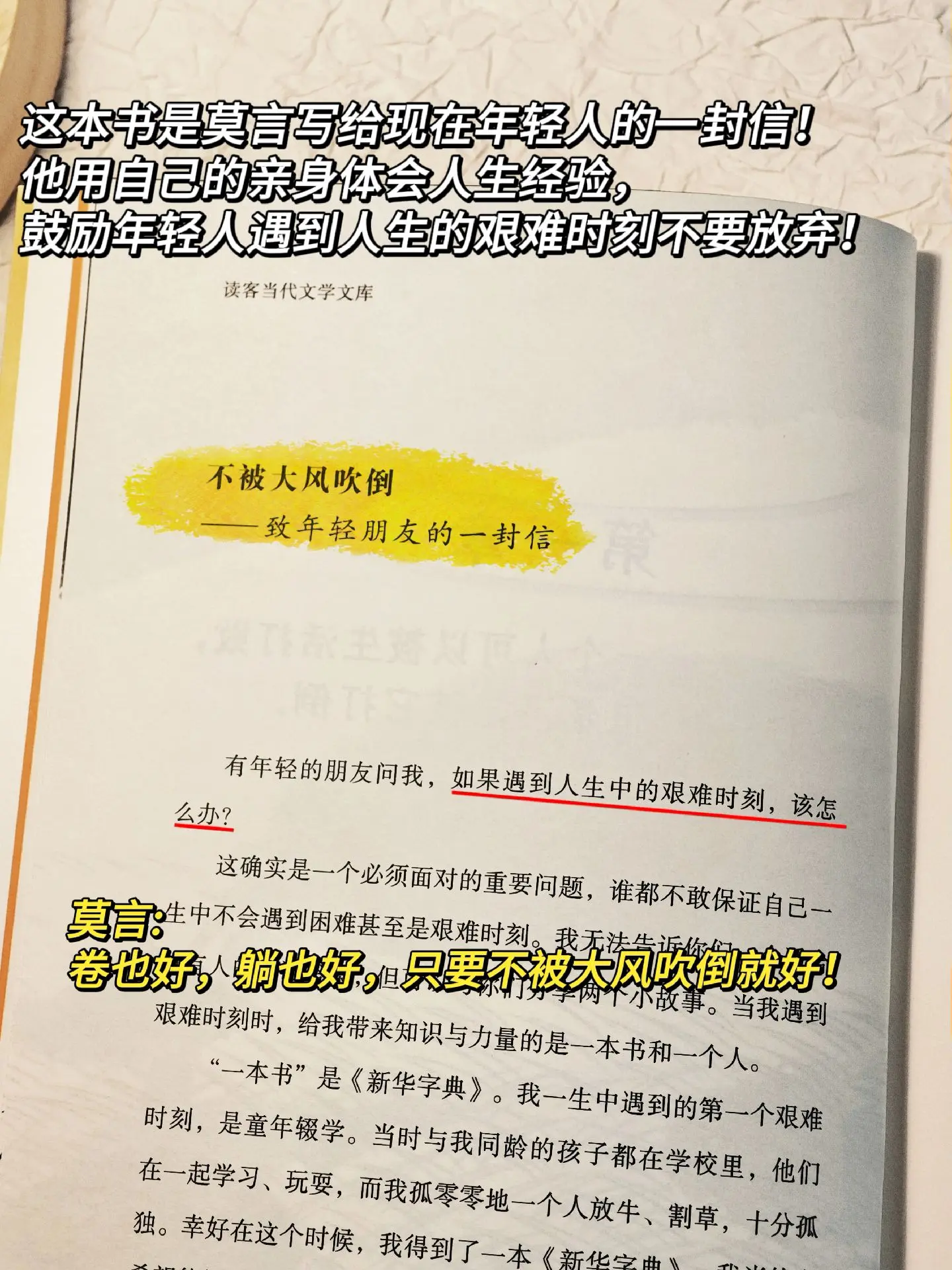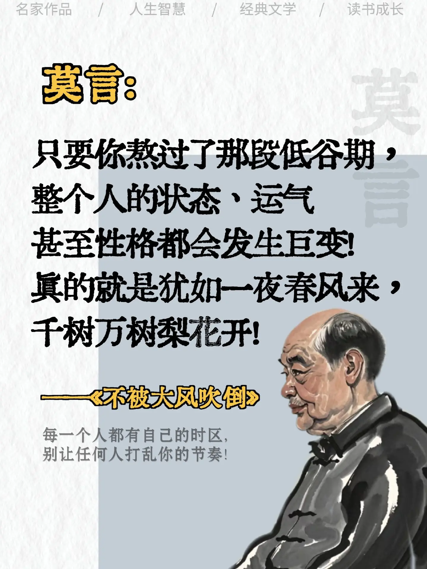 这个冬天被莫言老师新书彻底治愈了!“只要还活着,一切都有希望!水到绝处是风景,人到绝境是重生!”被莫言老师狠狠鼓励到了!莫言老师通过这本书告诉年轻人,请珍惜你的低谷,你会看到很多真相,时间能渡的都是愿意自渡的人,没有谁的人生一帆风顺,低谷期的苦难就是为了积蓄力量,哪怕是裂缝里透出的光,也要牢牢抓住,然后生出向阳而生的勇气!!如果你正焦虑迷茫深处低谷,推荐读一读这本书,会给你新的力量和启发!