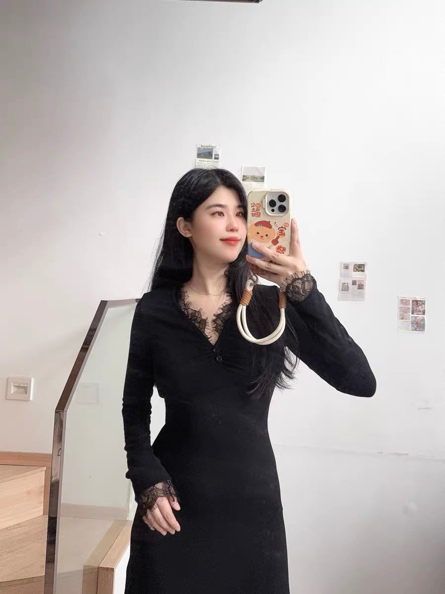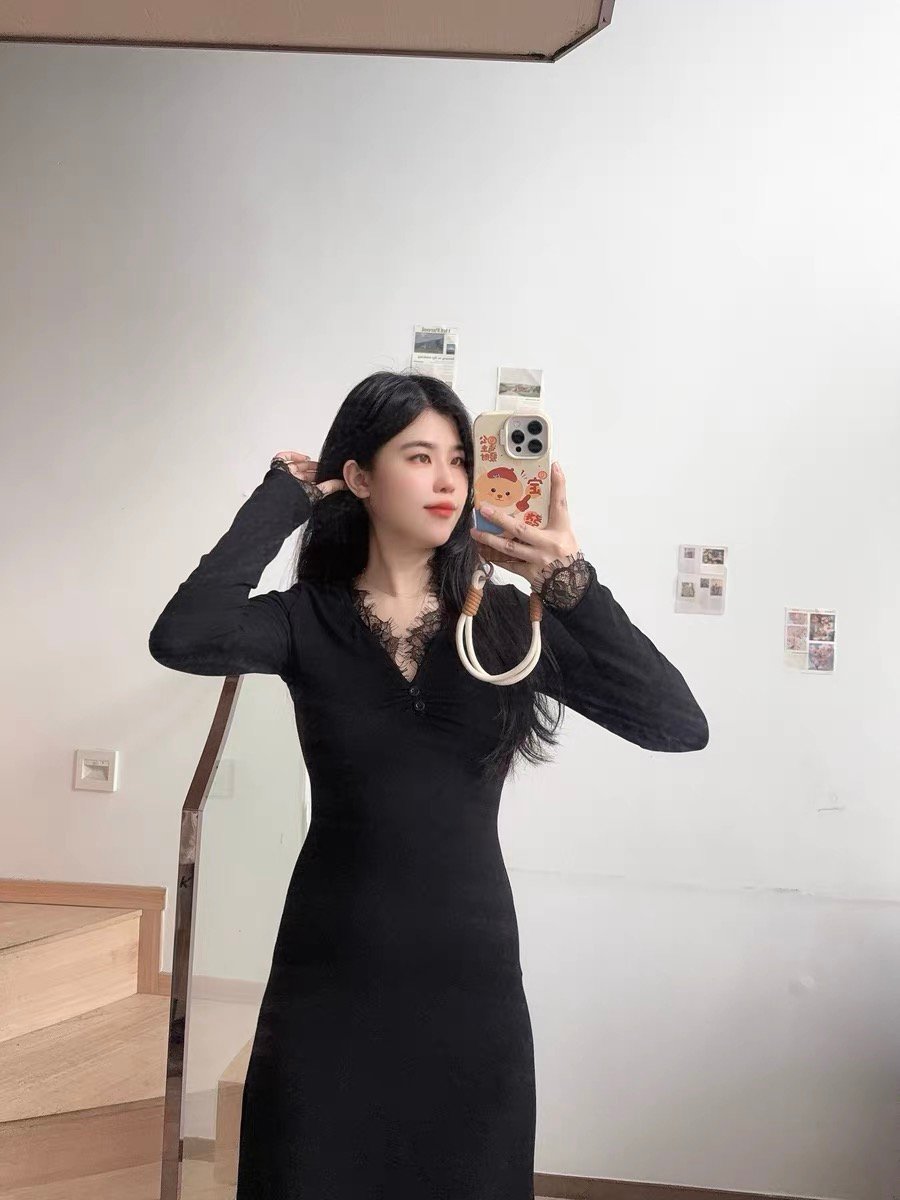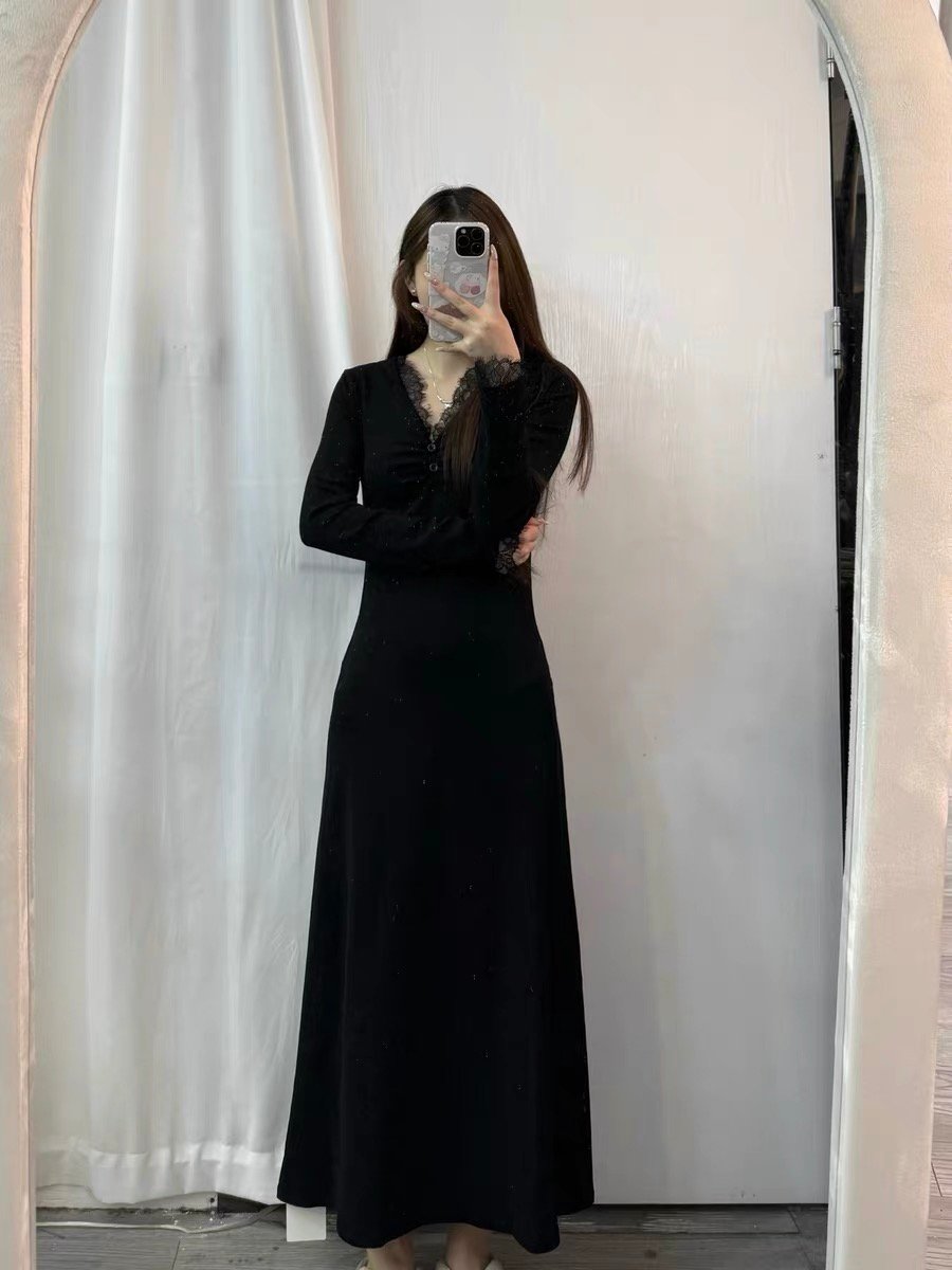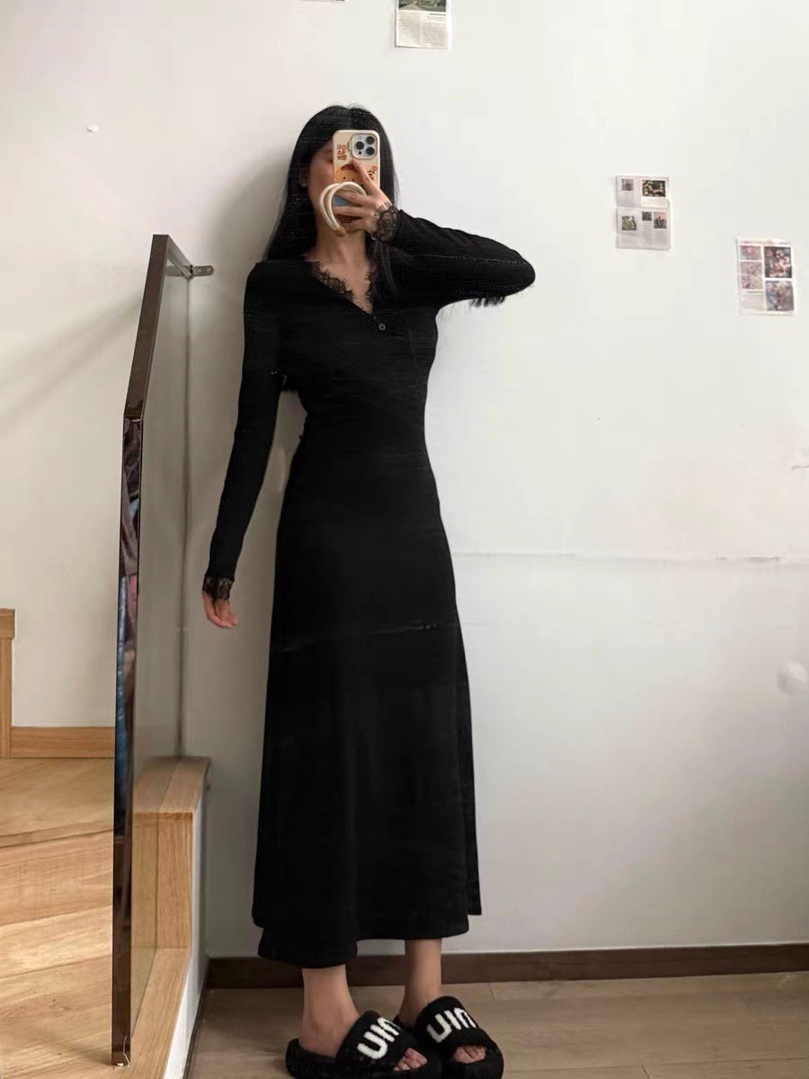 2024秋冬新款黑色v领蕾丝战袍连衣裙子女法式配大衣内搭打底长裙