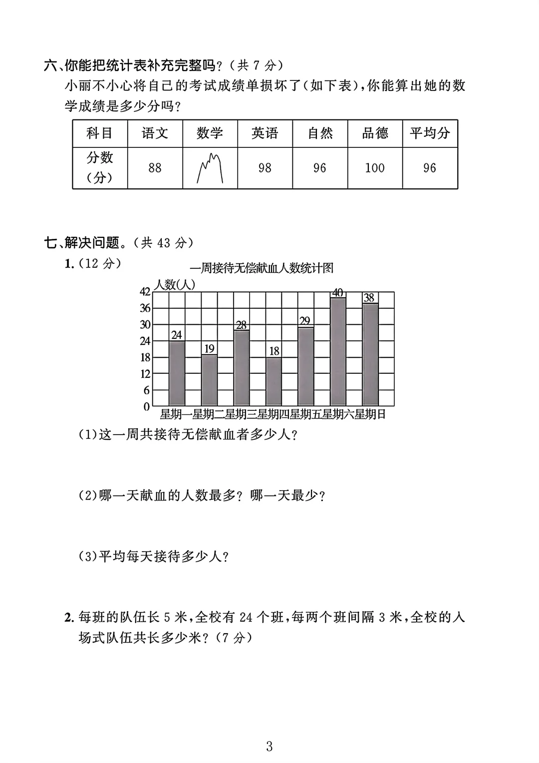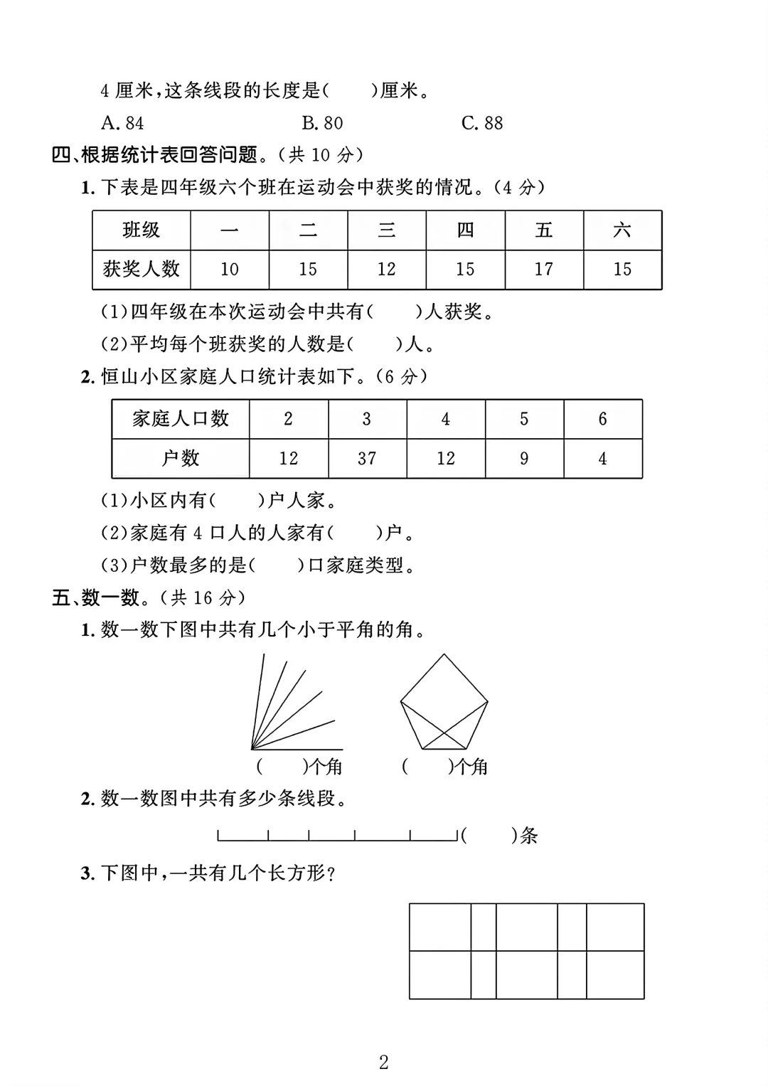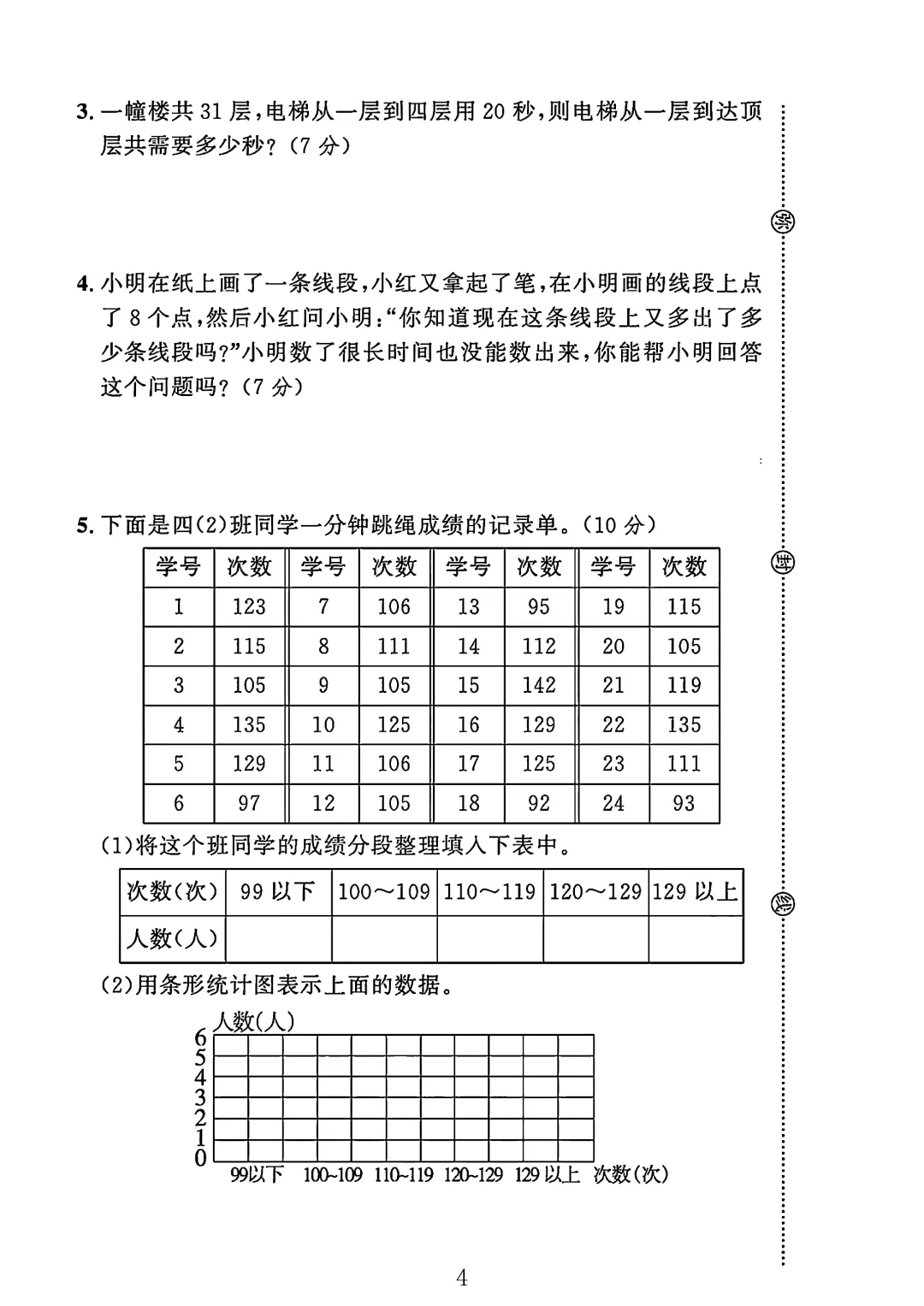 冀教版 四年级上册数学 单元测试 电子版可打印 试卷 小学数学