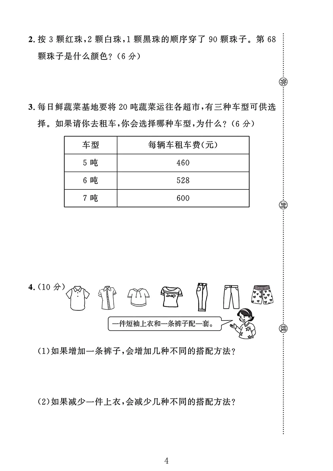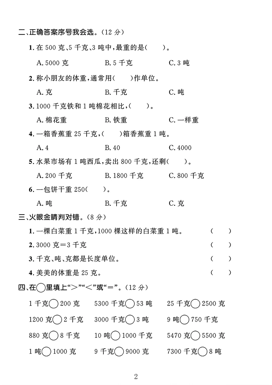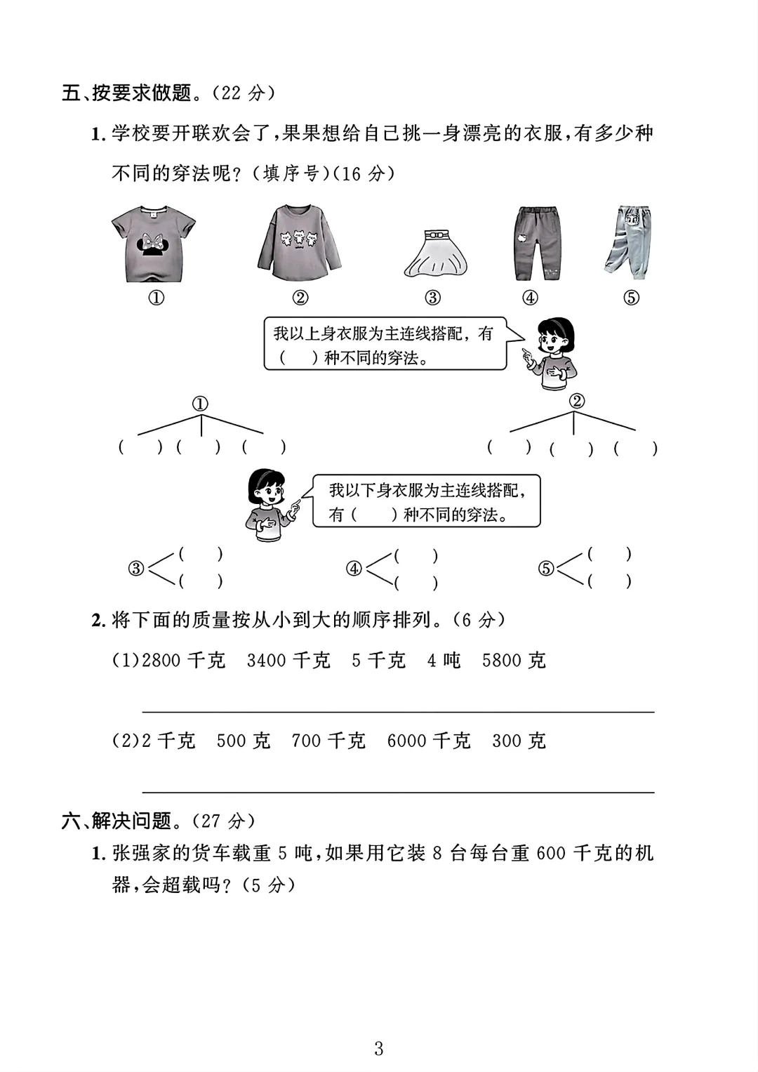 冀教版 三年级上册数学 单元测试 电子版可打印 试卷