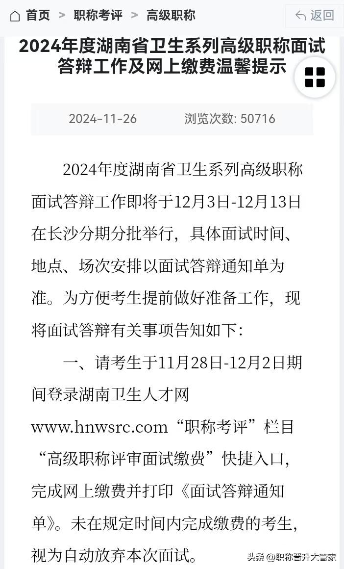 2024年度湖南省卫生系列高级职称面试答辩工作及网上缴费温馨提示!