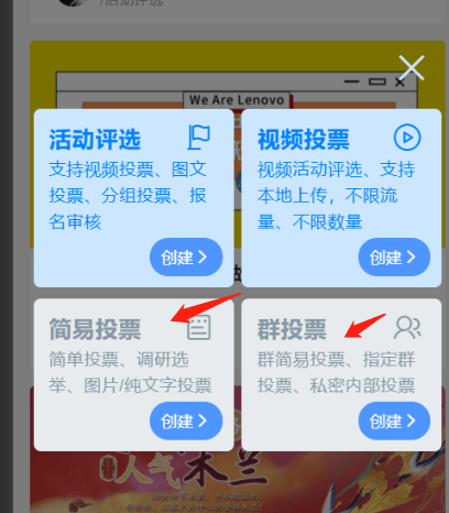 2. 进入小程序首页后,点击小程序下面的创建投票,根据需要选择不同的投票的类型。活动评选、视频投票适合公开大型的比赛评选活动,简单投票适合简单的调研选举,群投票适合不公开的投票。按需选择就可以了。一般来说如果是微信群投票不公开的,选择群投票就可以了。