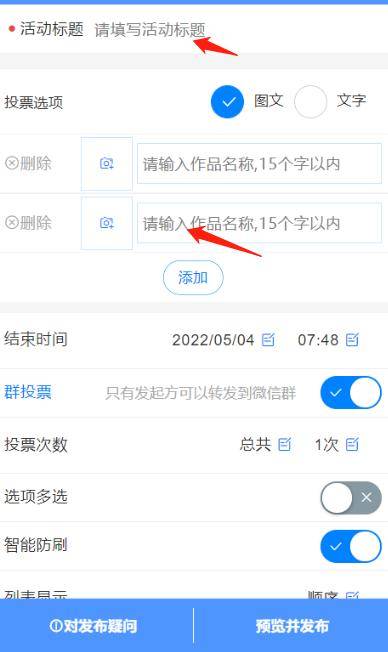 3.点群投票进入后,填写一下活动标题、添加两个及以上的作品,点击预览并发布即可。这样就完成了一个群投票的发起非常方便。