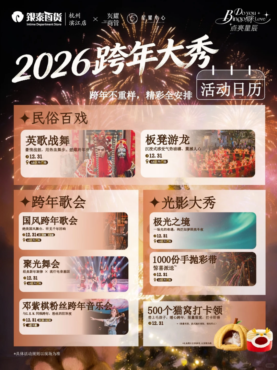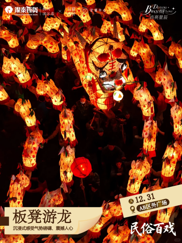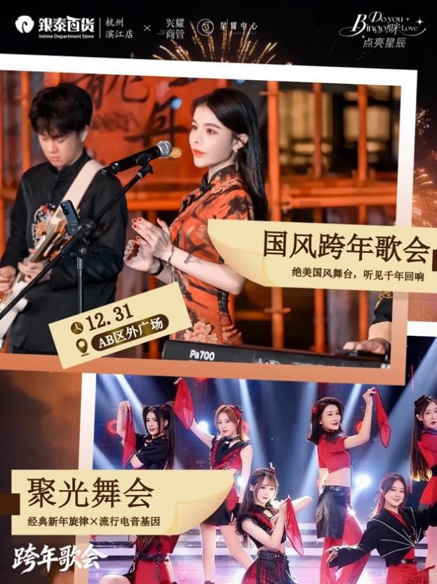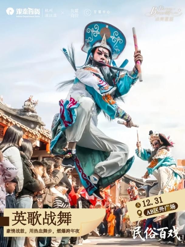 12月31日,杭州滨江银泰AB区外广场将启动跨年夜主题活动,以民俗展演、光影大秀、主题歌会三大核心板块,为市民打造一场沉浸式迎新盛宴、迎接2026年。