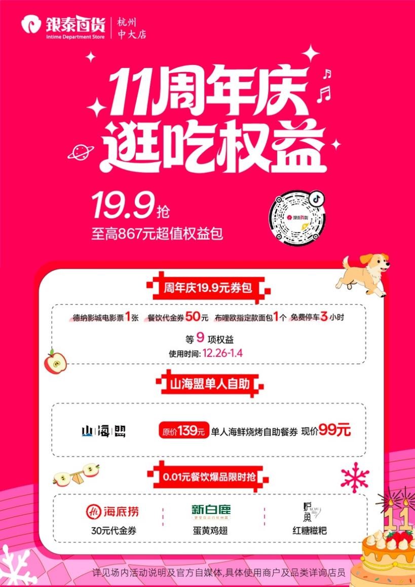 岁末迎新之际,中大银泰百货以“快乐one one岁”为主题,正式开启11周年庆友好狂欢季。活动期间,商场将推出系列快闪活动,打造跨年夜主题派对,并上线超值逛吃权益,为消费者带来集娱乐、消费、互动于一体的沉浸式体验。