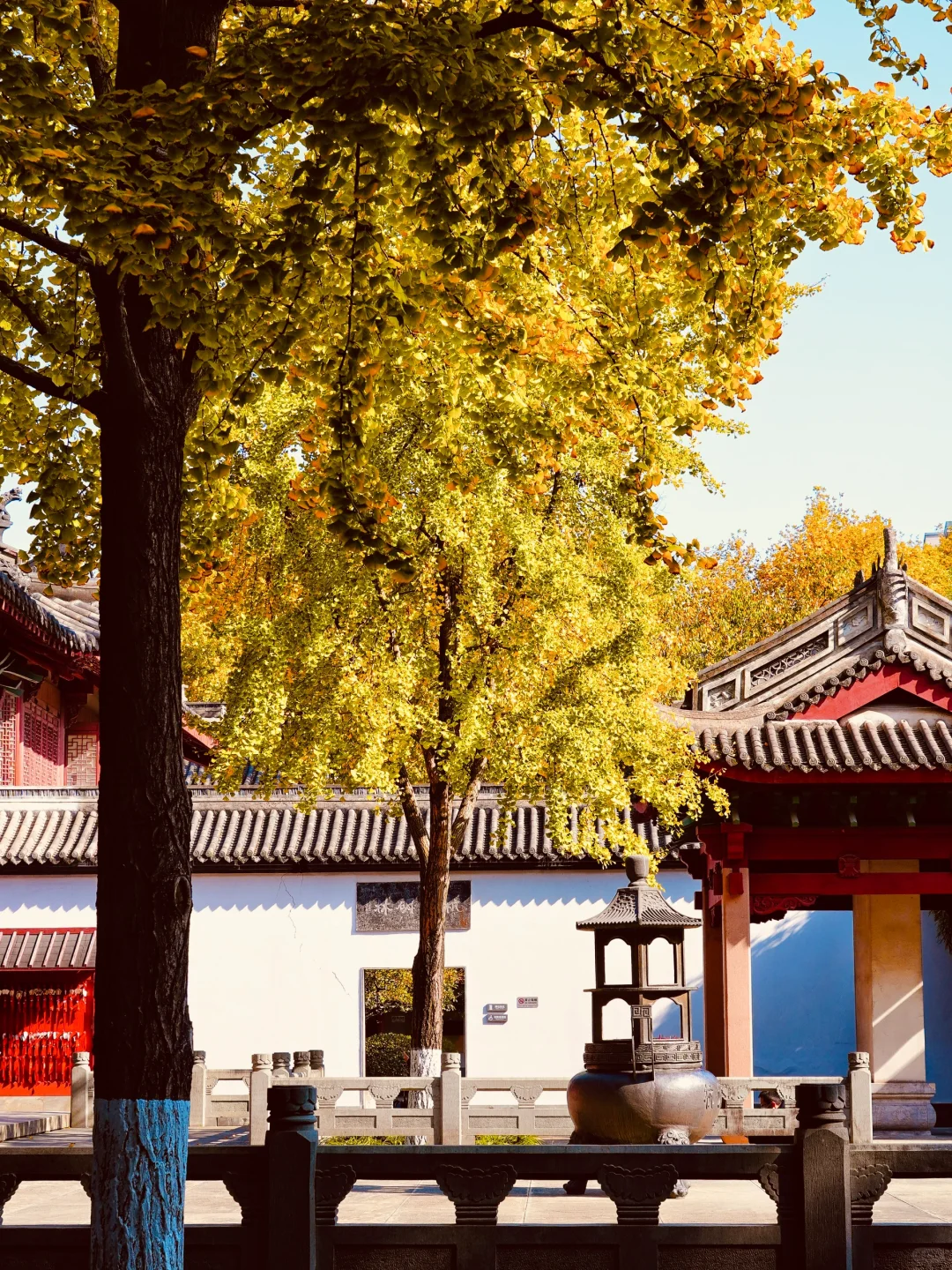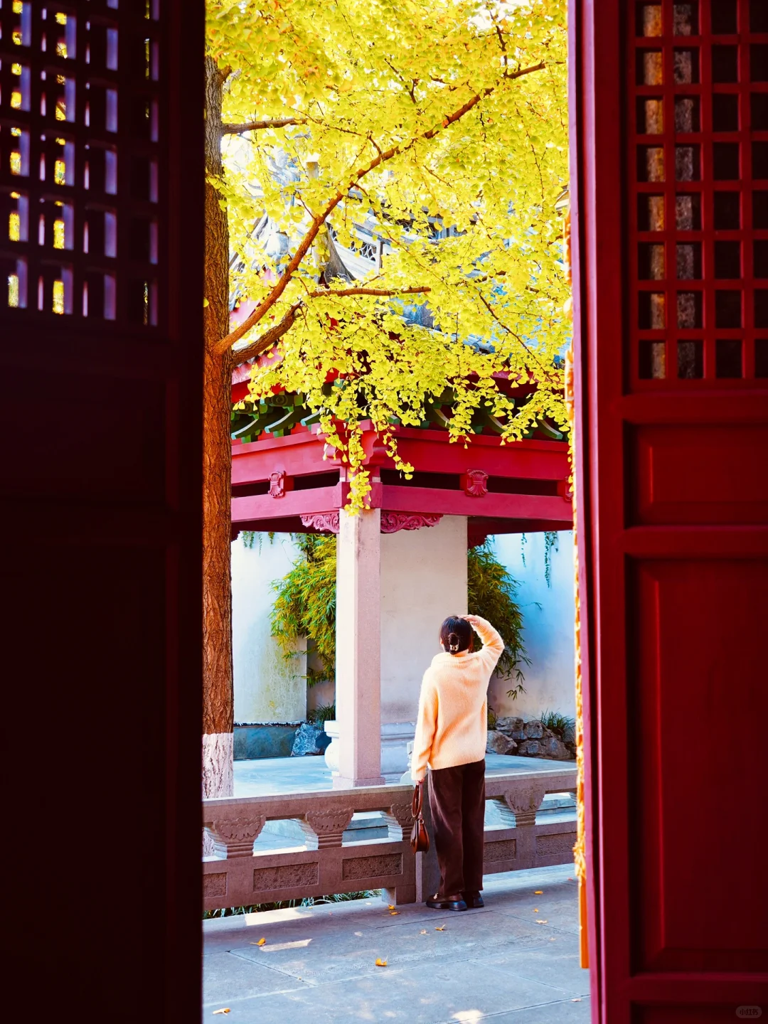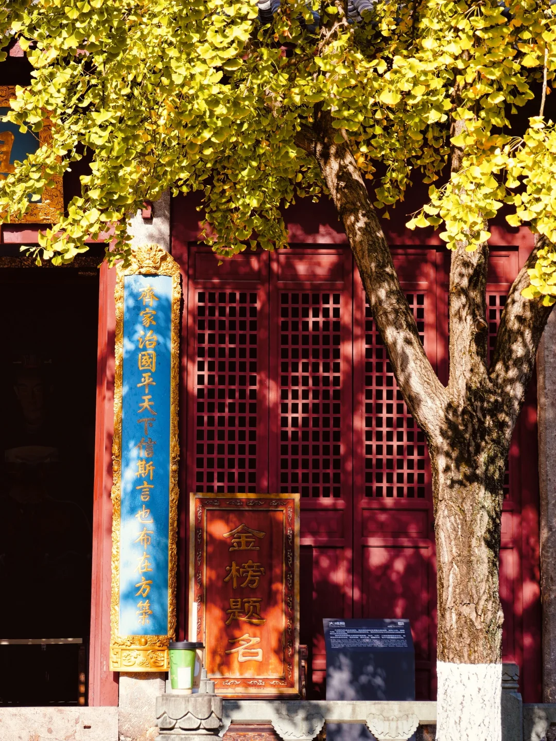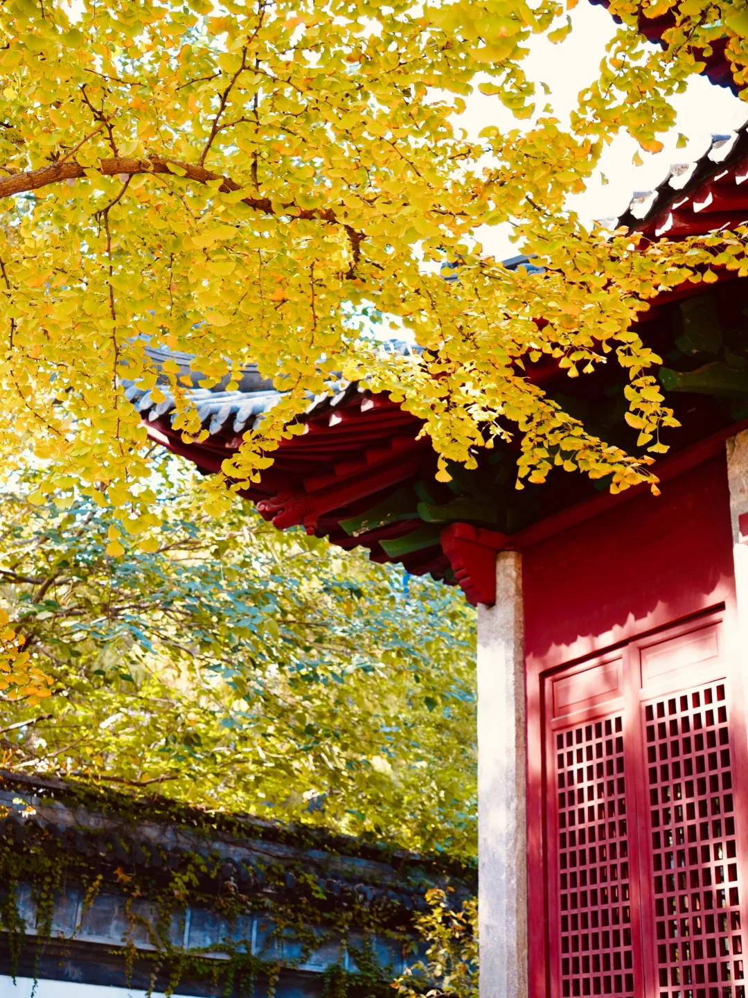 最近降温,杭州孔庙的银杏已经逐渐变黄了。这里的红墙黛瓦和黄色银杏相互交织,构成了一幅冬日画卷。阳光透过银杏,洒落在朱红色的门上,光影斑驳,显得很诗意美好!