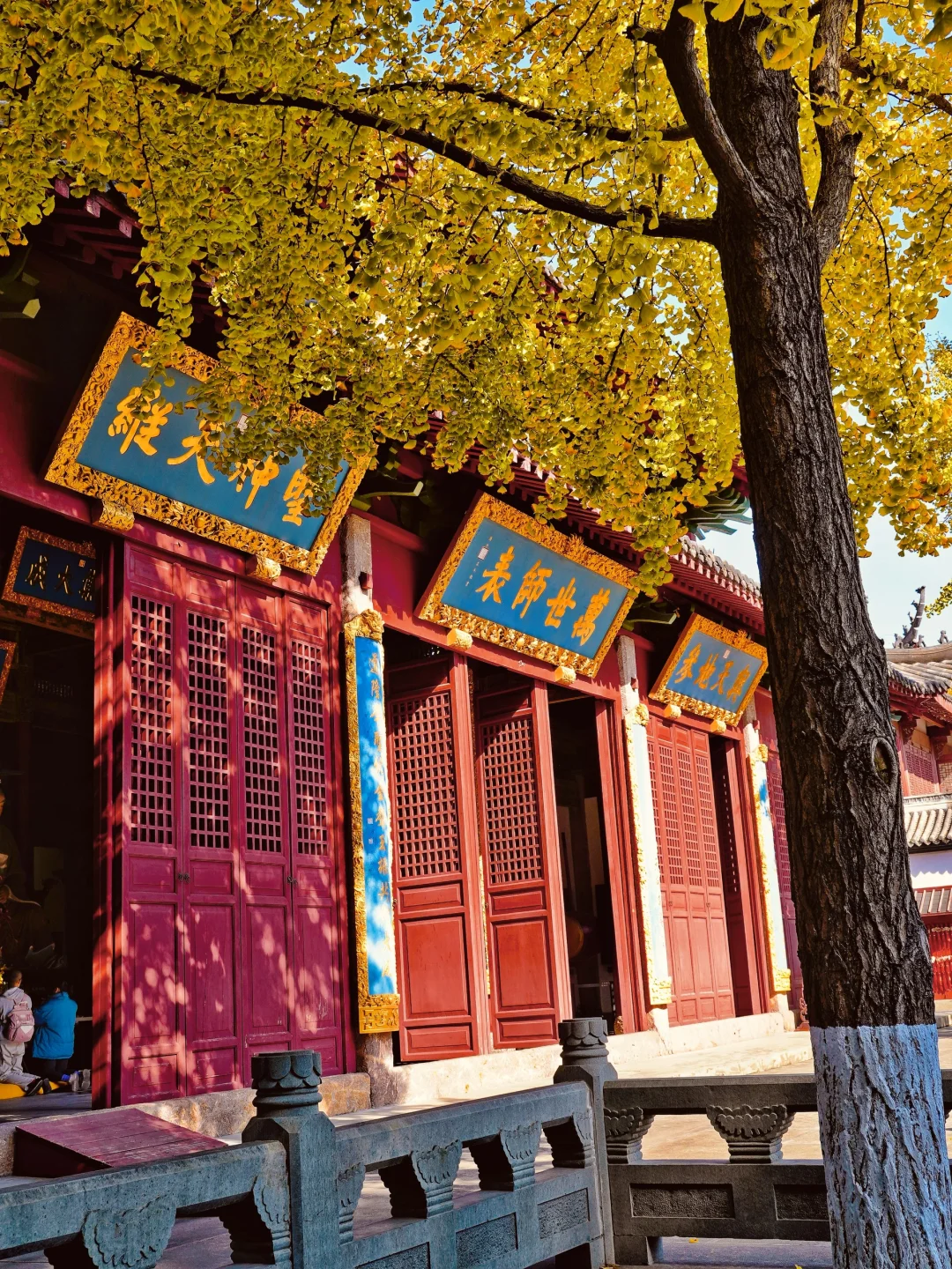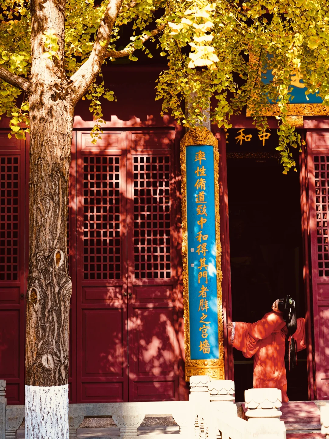 孔庙来的人很少,最近天气很好,银杏在阳光下显得特别黄,很适合去这里拍红色古风照。