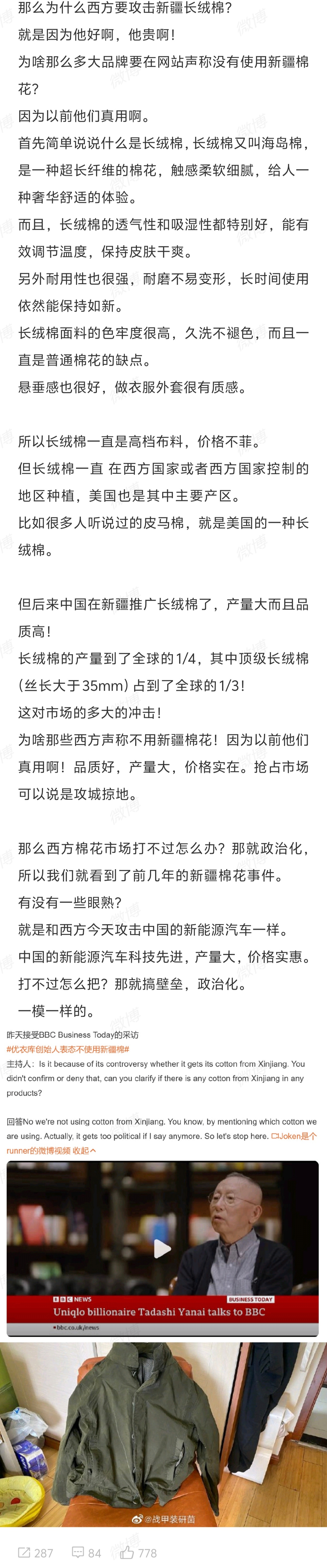 优衣库不用纯纯是因为怕欧美制裁,BBC特别坏,故意找这个问,优衣库之前回避这个问题,这次无意还是有意掉进BBC的坑。