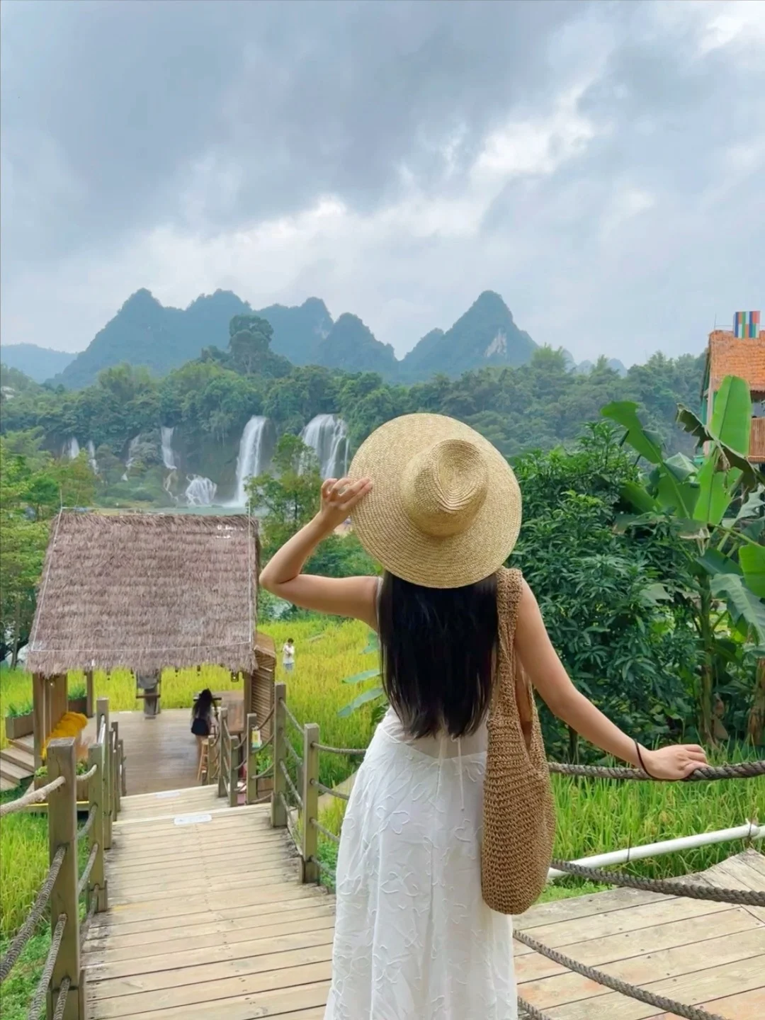 ✔️观赏横跨两国的德天跨国 瀑布,带娃坐竹排靠近瀑布,近距离感受磅礴的水雾,下竹排就是观景台上山入口,先去打卡稻田咖啡厅☕再去观景台拍瀑布全景