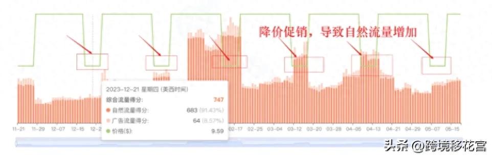 到了 7 月 8-11 日,也就是亚马逊会员日期间,流量突然猛增,得分冲到了 741 的高峰 —— 这是因为它借了会员日的热度,做了大规模推广;