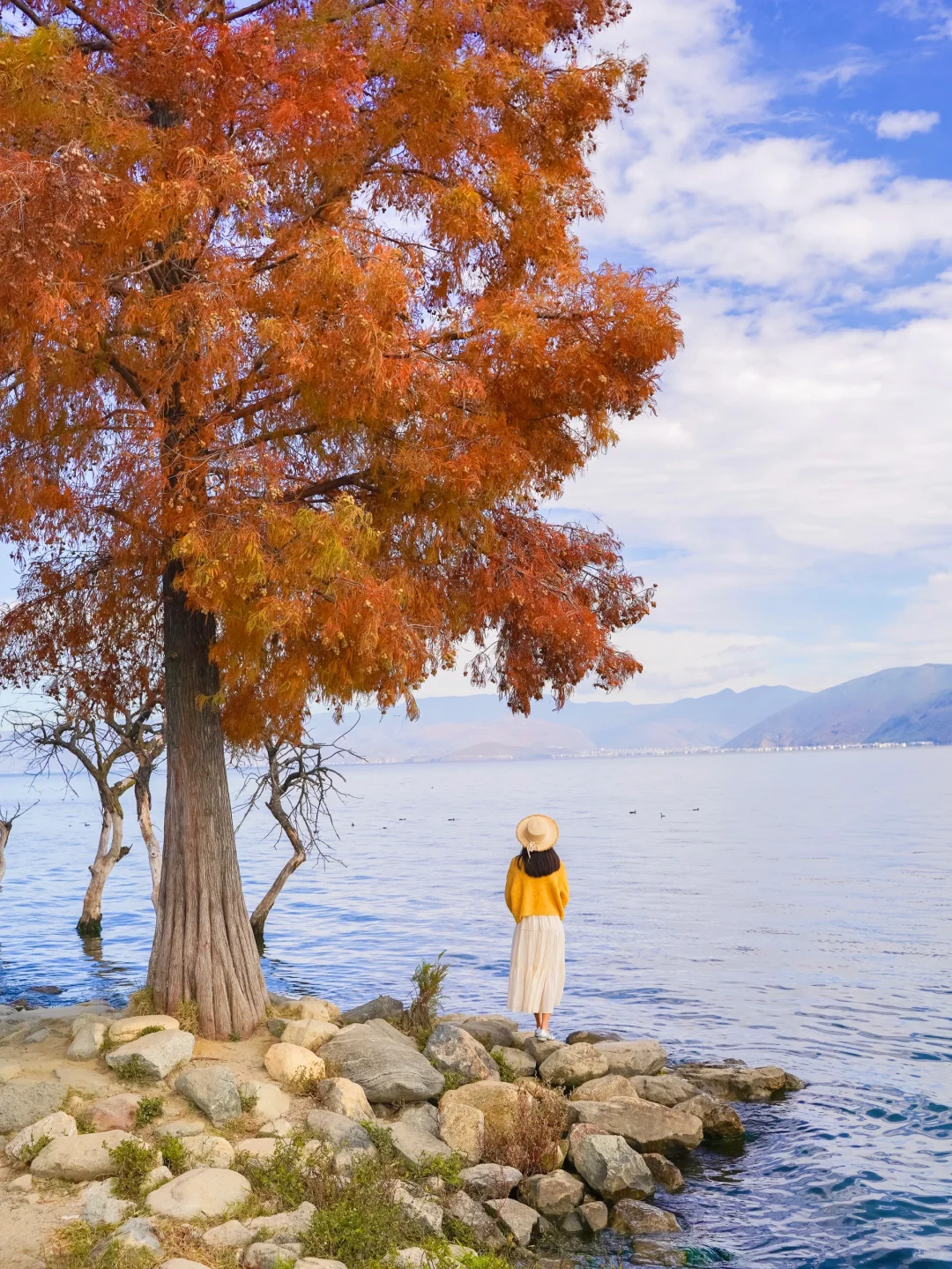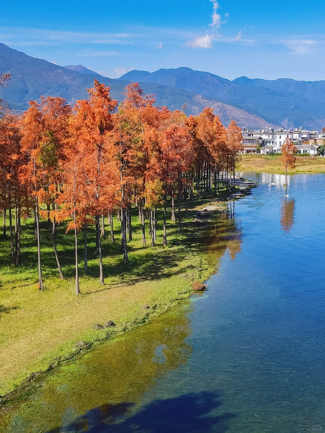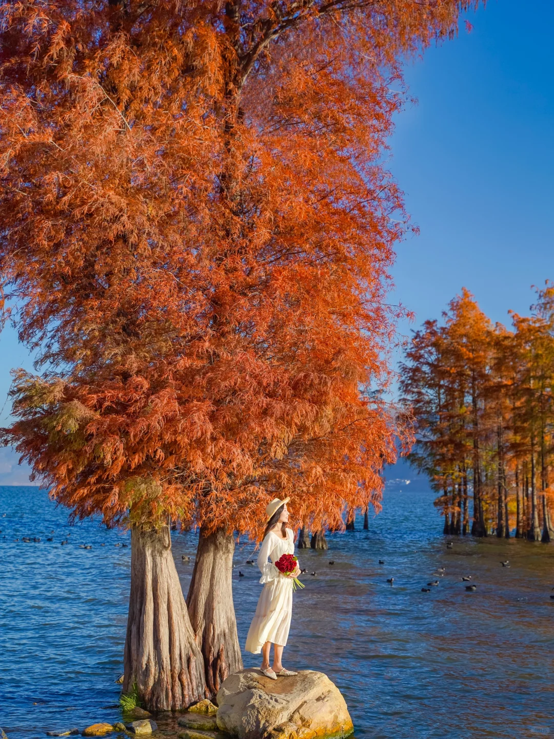 📍廊桥(p4,11)廊桥洱海上的水杉已经红透了,站在廊桥桥洞旁还可以与水杉同框,附近也有一些枯树,搭配红衫好绝。