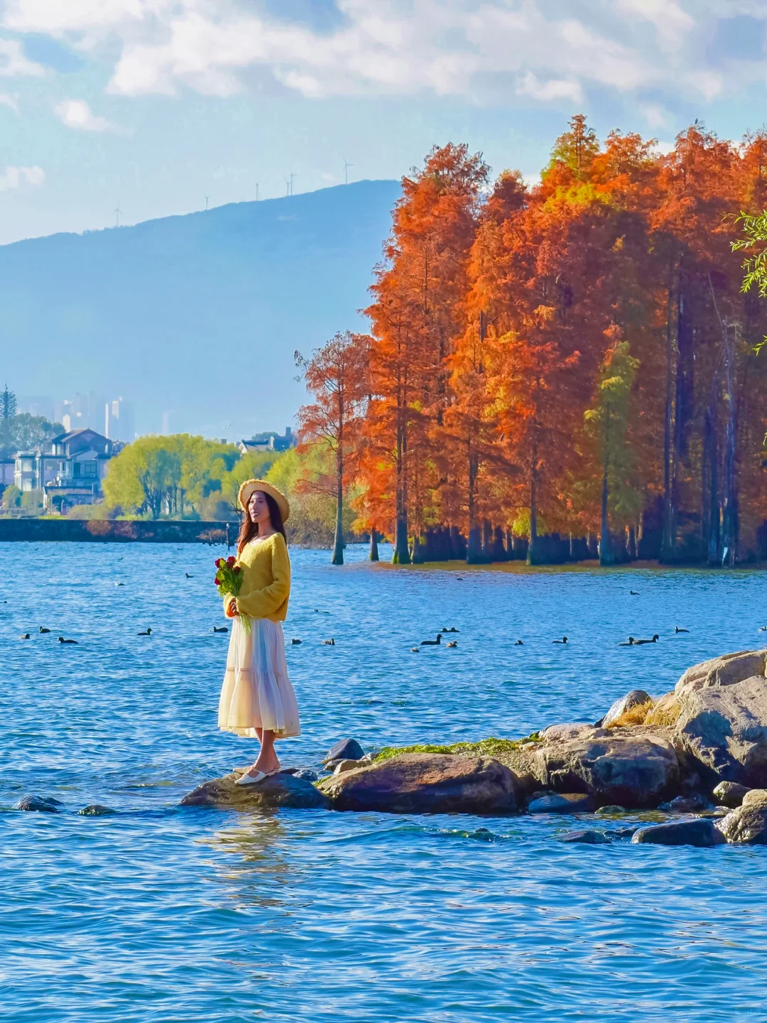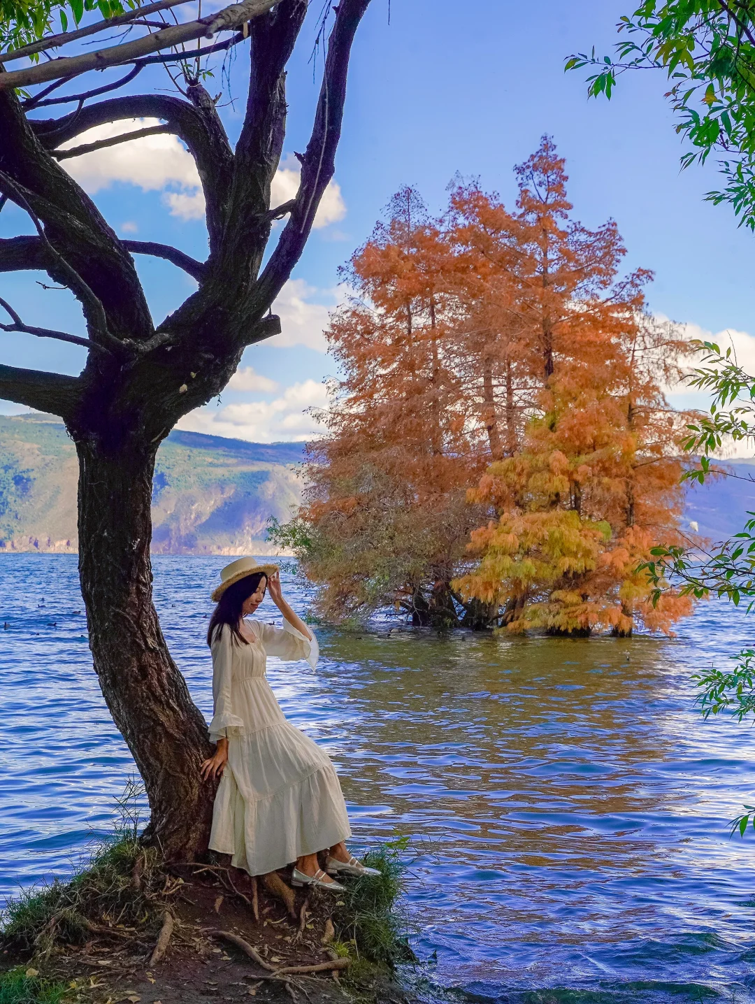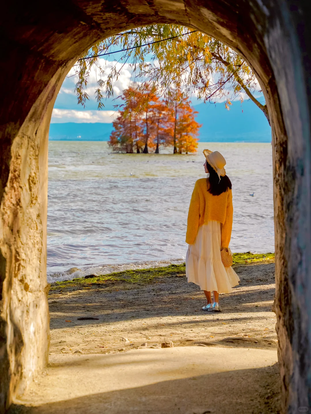 📍廊桥(p4,11)廊桥洱海上的水杉已经红透了,站在廊桥桥洞旁还可以与水杉同框,附近也有一些枯树,搭配红衫好绝。