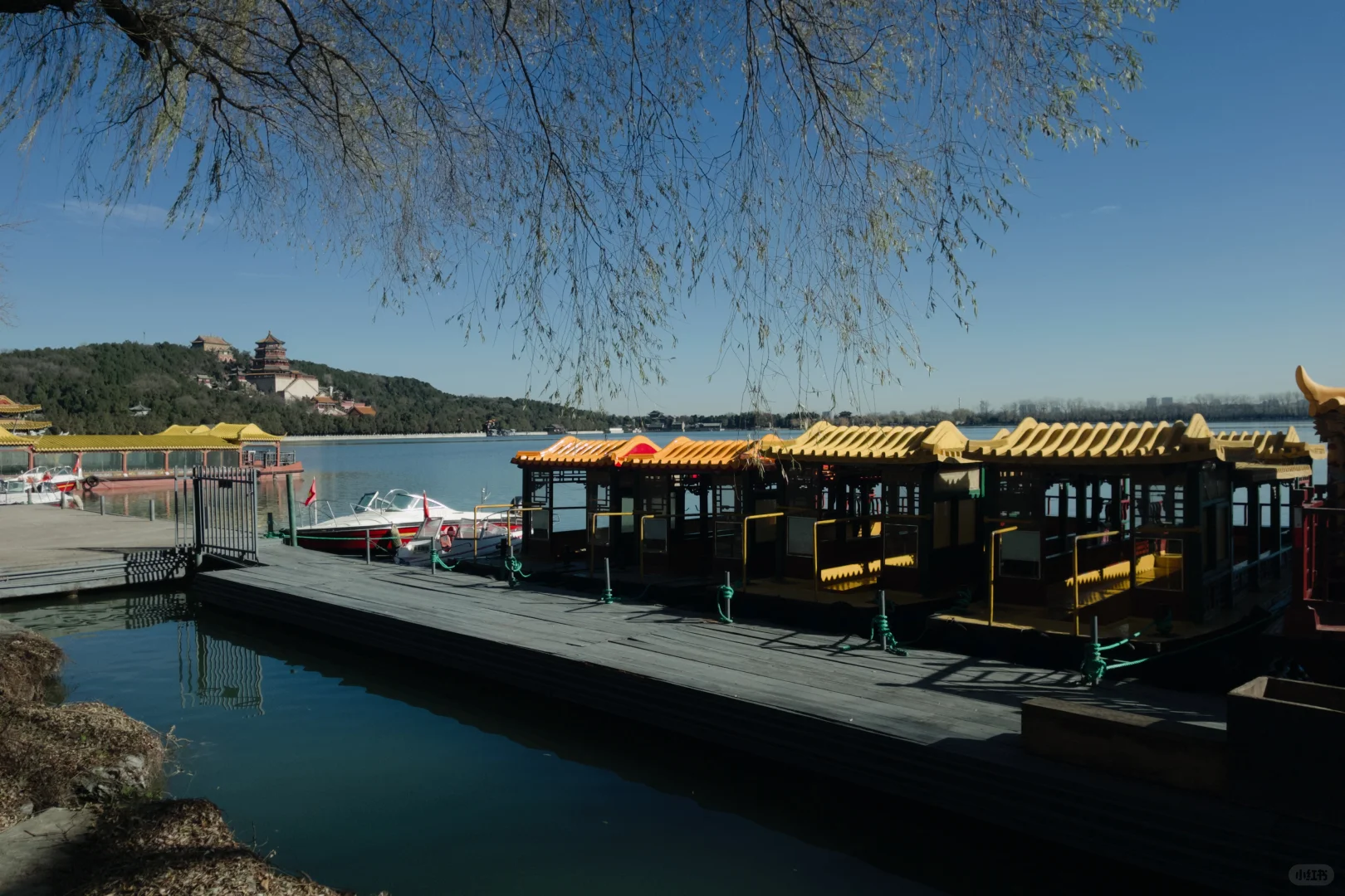时隔四年我又来北京 这一次是玩 20年的时候因为草莓音乐节志愿者 短暂在北京停留 没有去到颐和园圆明园等 甚是遗憾 这次有空想好好看看 所以下火车第一件事 马不停蹄坐地铁到颐和园 - 虽然在郊区有点远 当我抵达昆明湖畔的时候 波光粼粼非常美好 阳光照射下的湖面泛起涟漪 我无法想象在几百年的大清时期 这里曾经又是什么样的景象 周围的树木已经三百多岁 阳光很温暖 长廊上的壁画让我驻足停留 想到全国导基里的颐和园的园林介绍 夹景、借景、对景…