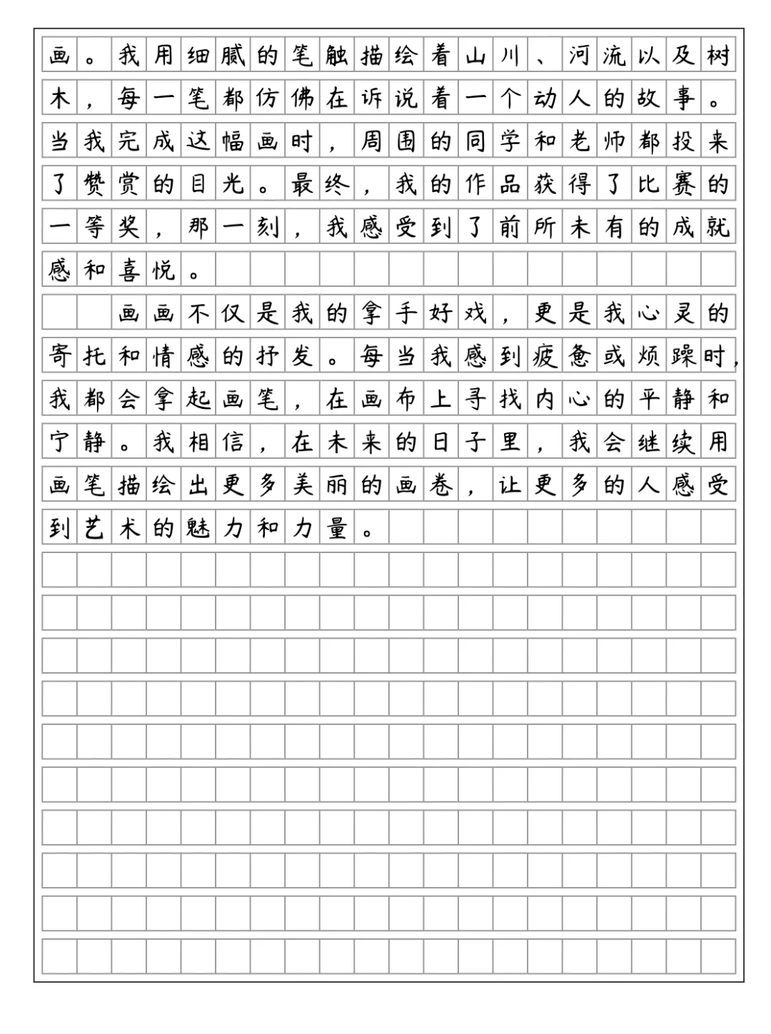 画画不仅是我的拿手好戏,更是我心灵的寄托和情感的抒发。每当我感到疲惫或烦躁时,我都会拿起画笔,在画布上寻找内心的平静和宁静。