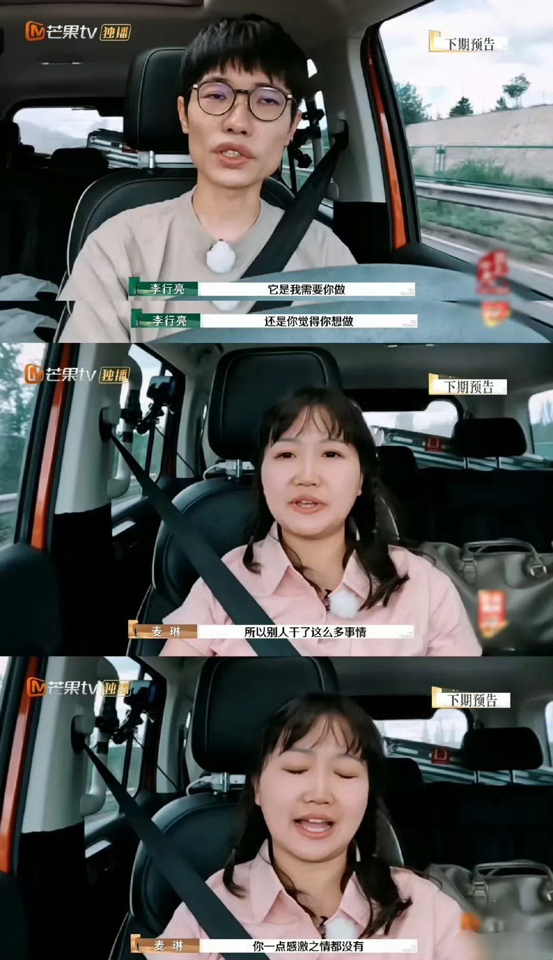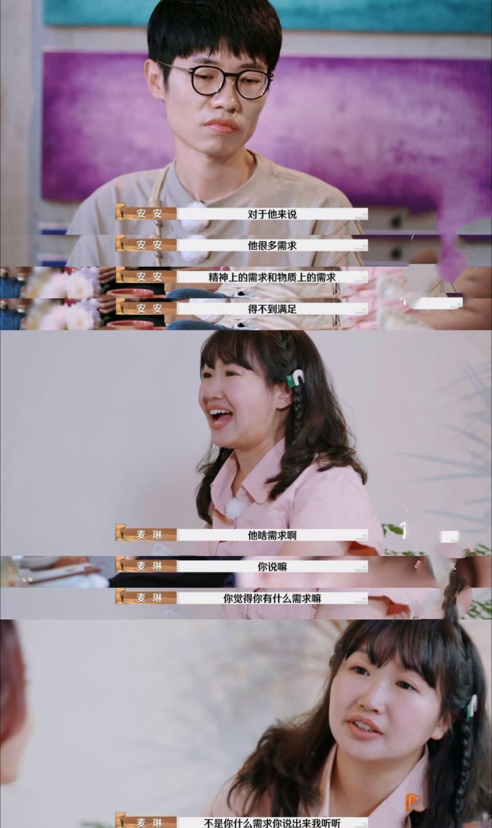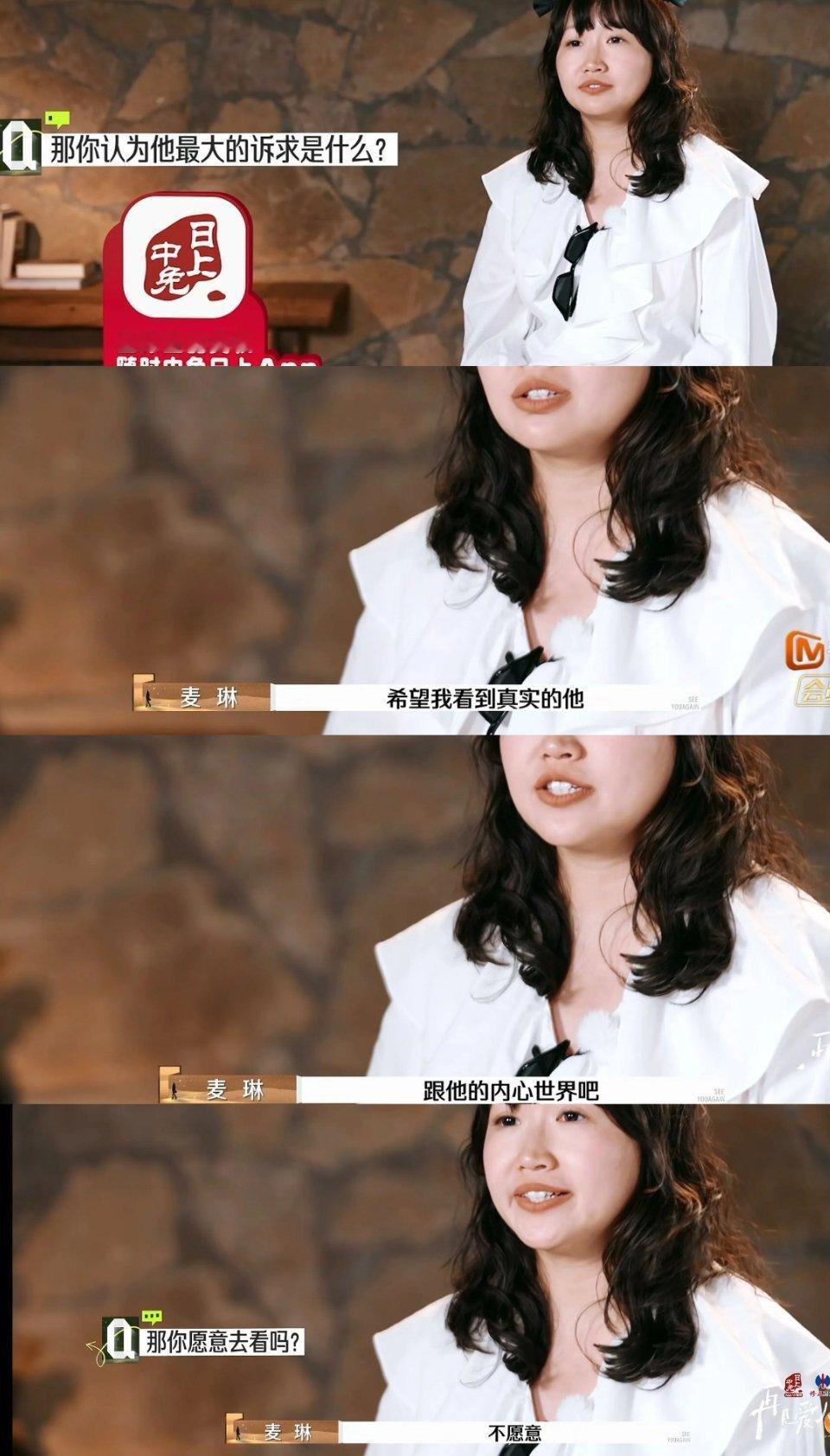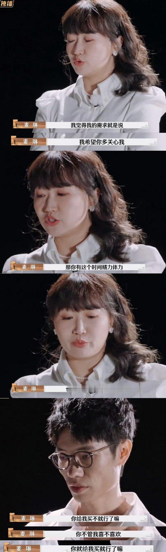 麦琳希望李行亮能看见她的付出 麦琳说李行亮朋友安安的出现,让她有一些反思,可安安让她去妈味,她反思完还是说希望李行亮能看见她的付出、需求和情绪。之前说不愿意看到真实的李行亮和他的内心世界,不理解李行亮的情绪,现在又说让李行亮打开真实的情绪和需要告诉她,好矛盾……