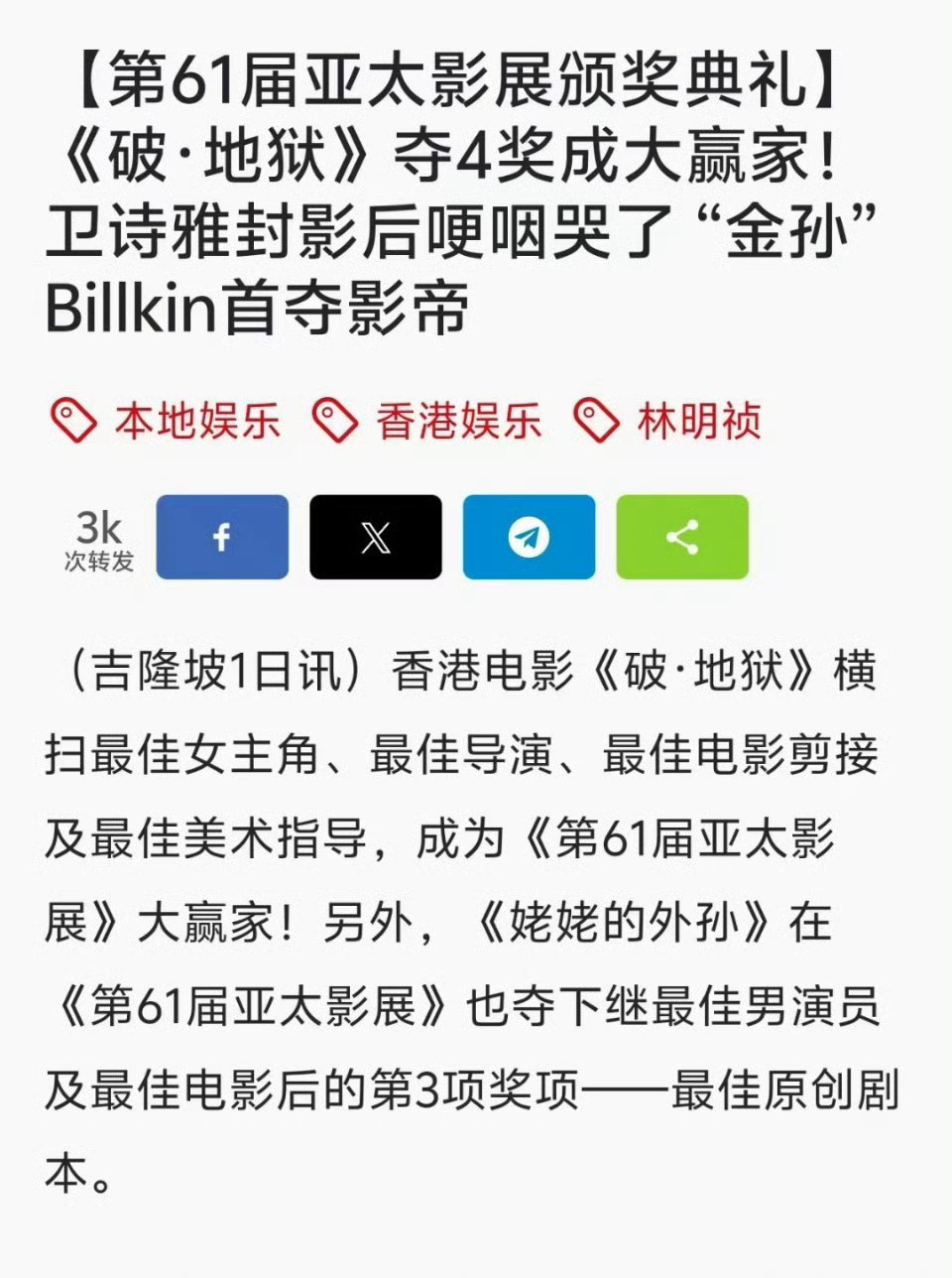 billkin首封影帝 billkin马群耀凭借《姥姥的外孙》获得第61届亚太影展(亚太电影节)最佳男主角,《姥姥的外孙》同时还获得最佳影片、最佳原创剧本!第一部主演电影就获得影帝,还是有史以来全球票房最高的泰国电影,恭喜🎉