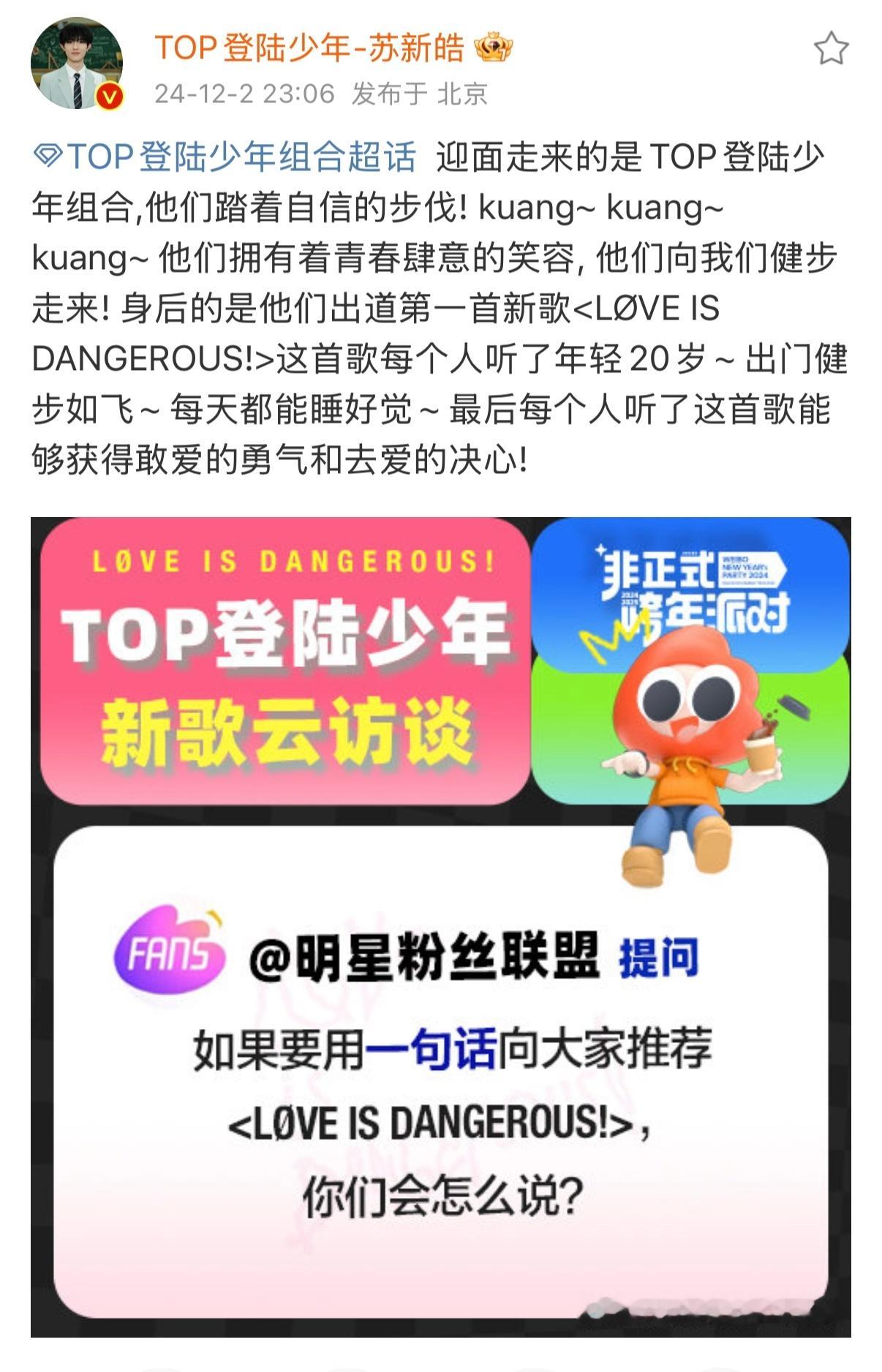 💭迎面走来的是TOP登陆少年组合,他们踏着自信的步伐! kuang~ kuang~ kuang~ 他们拥有着青春肆意的笑容, 他们向我们健步走来! 身后的是他们出道第一首新歌这首歌每个人听了年轻20岁~ 出门健步如飞~ 每天都能睡好觉~ 最后每个人听了这首歌能够获得敢爱的勇气和去爱的决心!