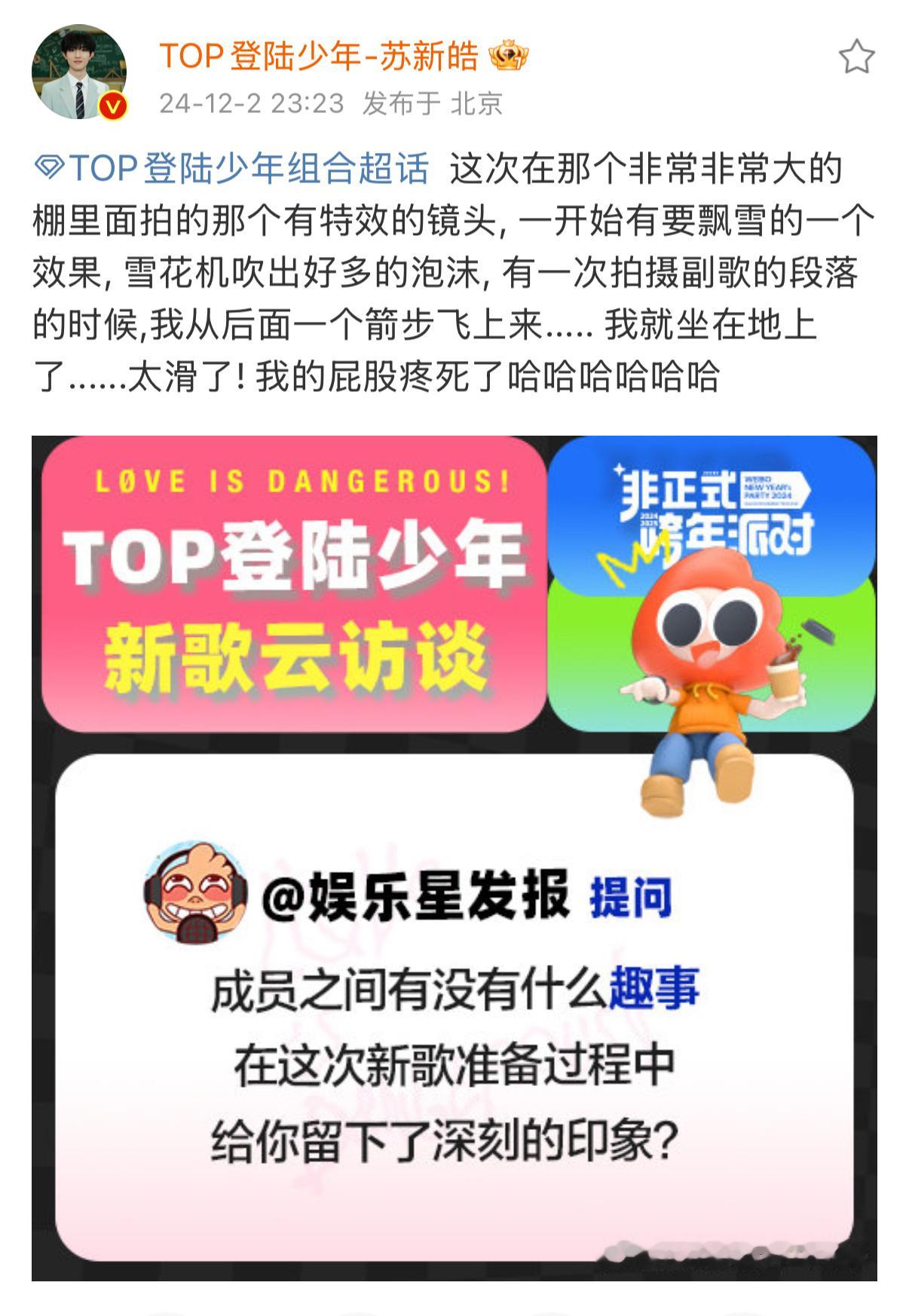 💭这次在那个非常非常大的棚里面拍的那个有特效的镜头, 一开始有要飘雪的一个效果, 雪花机吹出好多的泡沫, 有一次拍摄副歌的段落的时候,我从后面一个箭步飞上来..... 我就坐在地上了......太滑了! 我的屁股疼死了哈哈哈哈哈哈