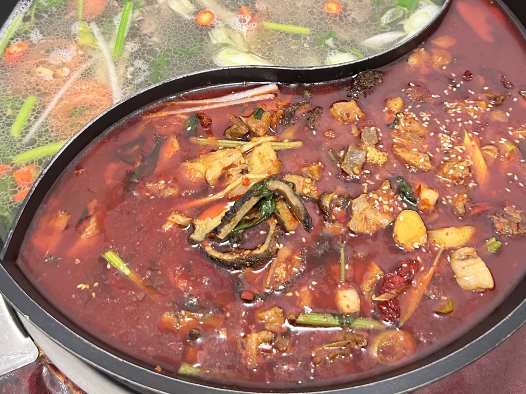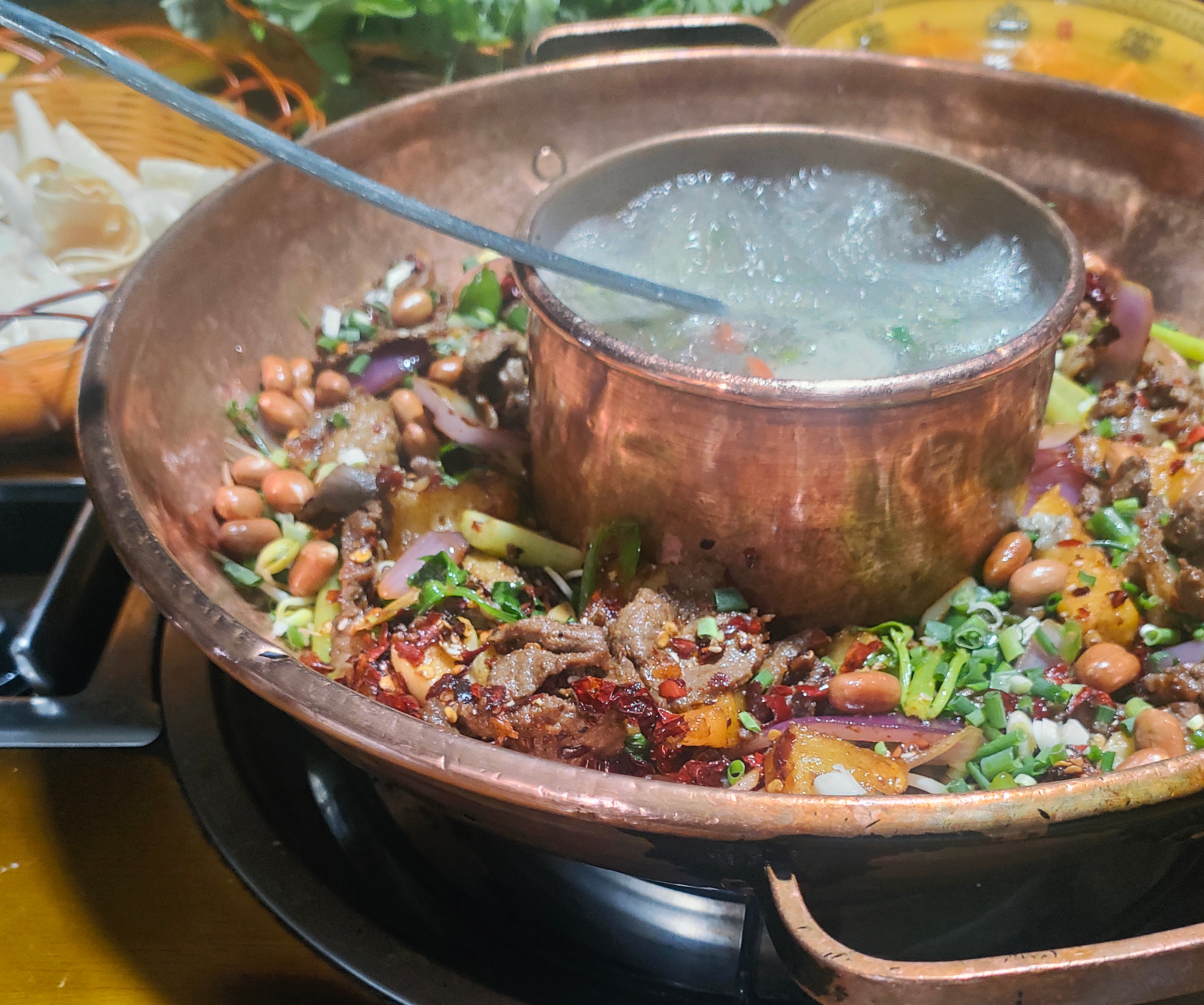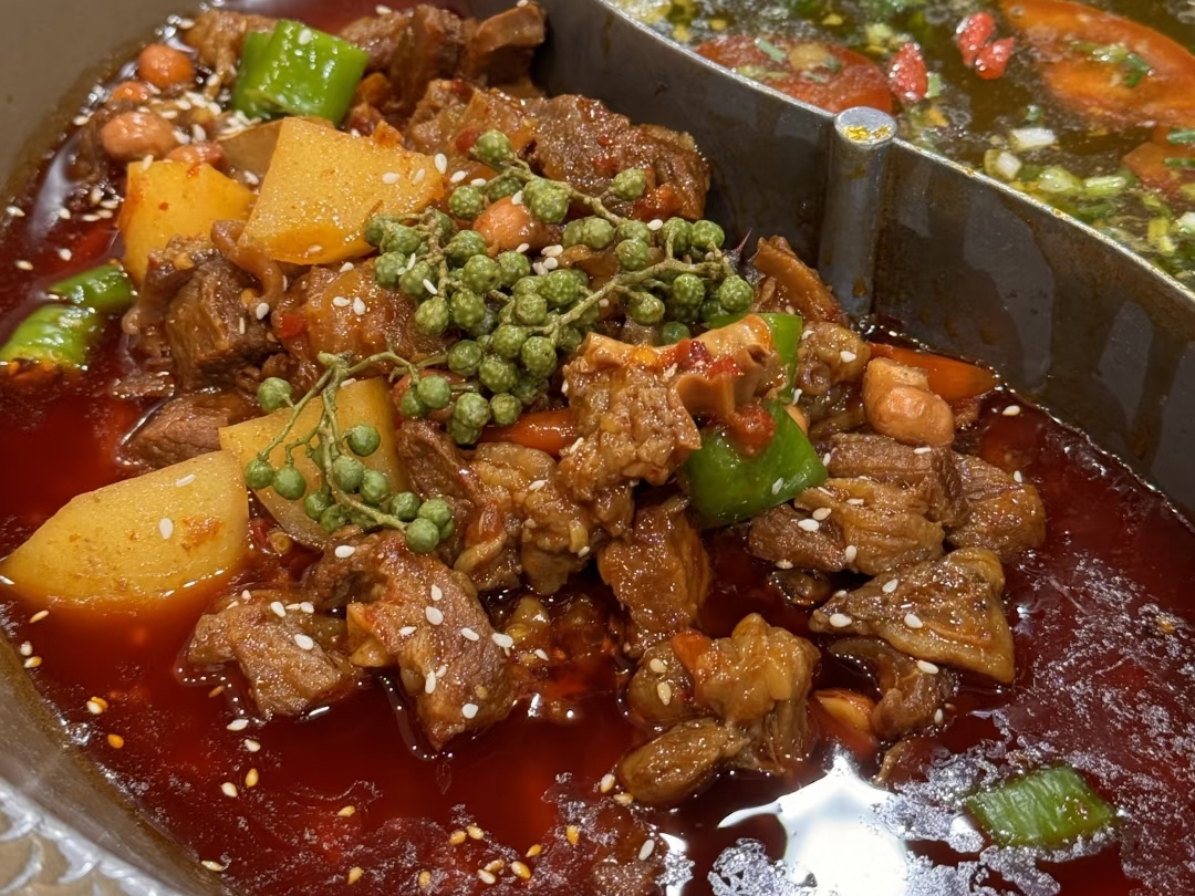 最具代表性的吃法之一,用贵州糍粑辣椒和香料炒制的麻辣锅底,加上本地黄牛肉充分炒匀,让每一块牛肉都裹满底汁香料。猛火爆炒,快速锁汁的牛肉,麻辣干香,焦而不柴。铜锅中间盛满清汤,涮菜涮肉,一锅两吃,风味绝佳。