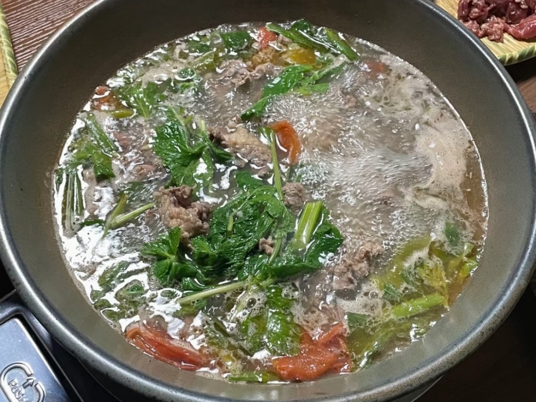清汤牛肉火锅是六盘水牛肉的经典吃法,牛骨与牛骨髓熬制的清汤,汤色清澈,味道鲜香回甘,最适合先喝一口汤再涮肉。本地小黄牛,肉质鲜嫩口感紧实。地道的糊辣椒蘸水,辣椒的糊香与辣味配合,融入折耳根的清爽,让一块看似平常,实则无敌的牛肉,口感层次更加丰富饱满。