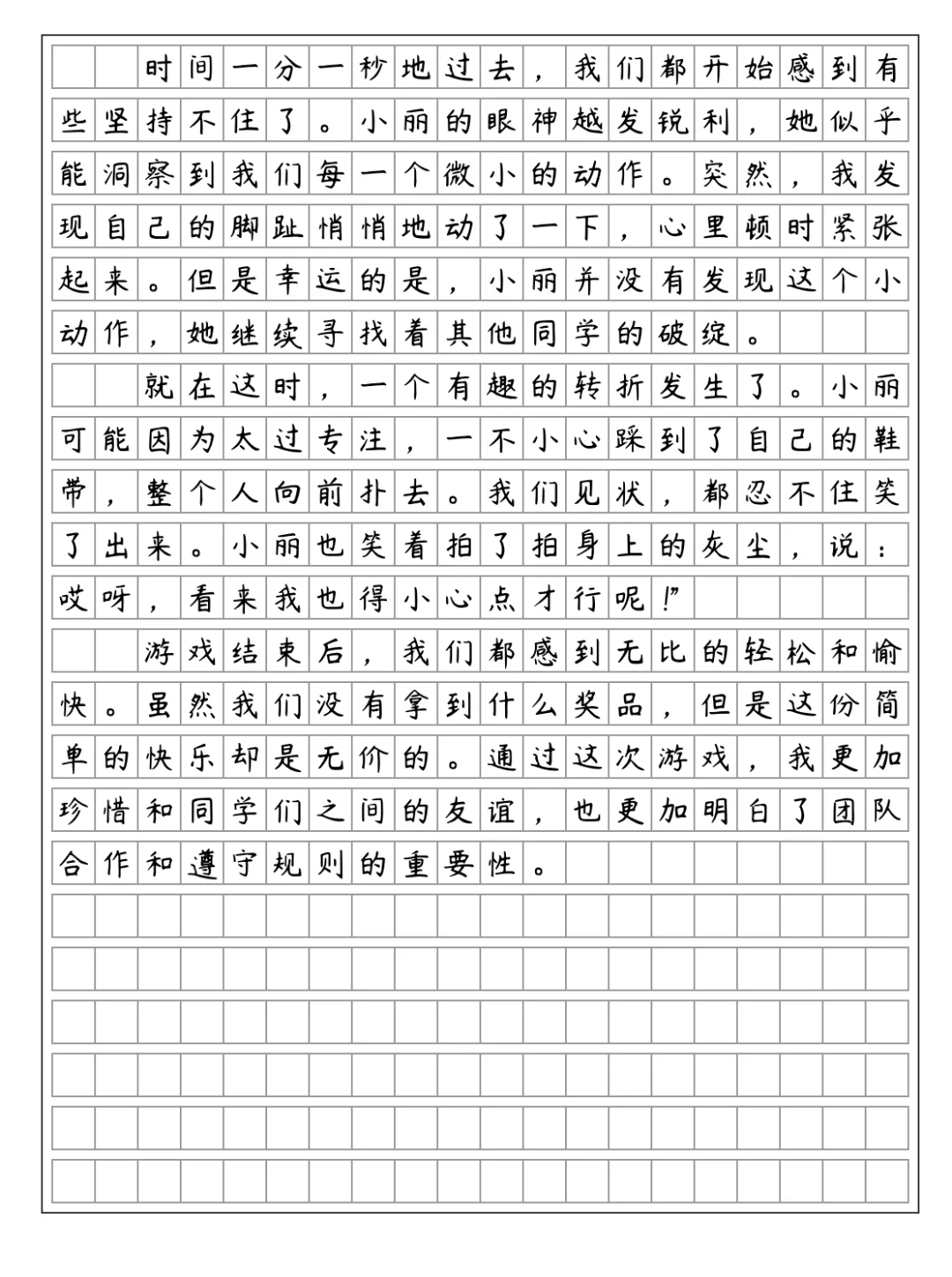 四年级上册第六单元作文 一二三木头人。简单的快乐是无价的,通过这次游戏,我更加珍惜和同学们之间的友谊,也更加明白了团队合作和遵守规则的重要性。