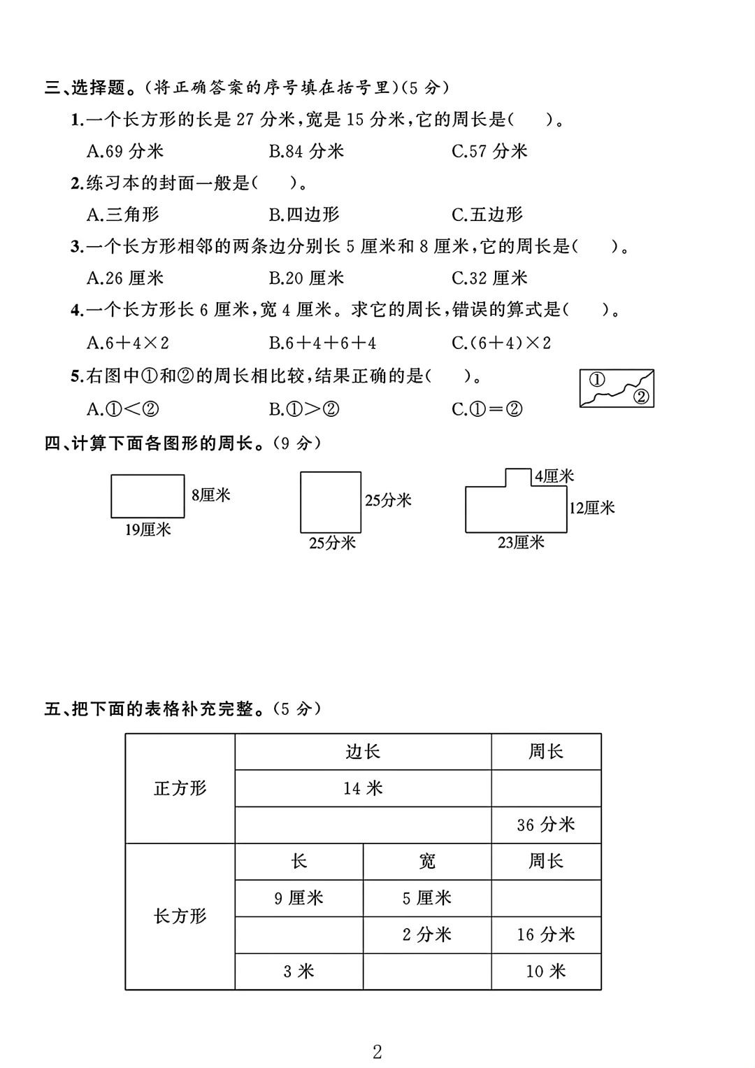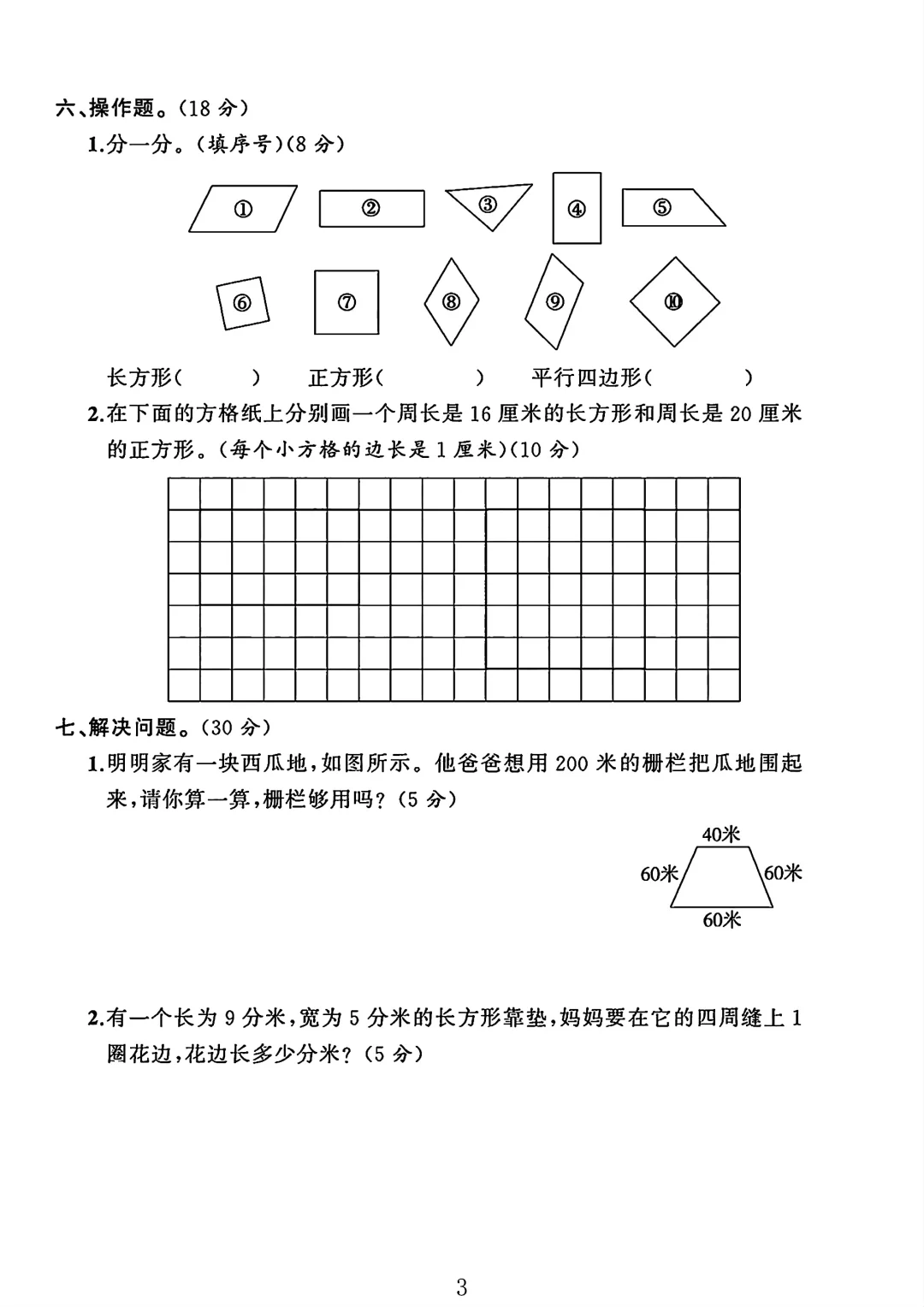 人教版 三年级上册数学 单元测试 第七单元 试卷 电子版可打印 测试卷