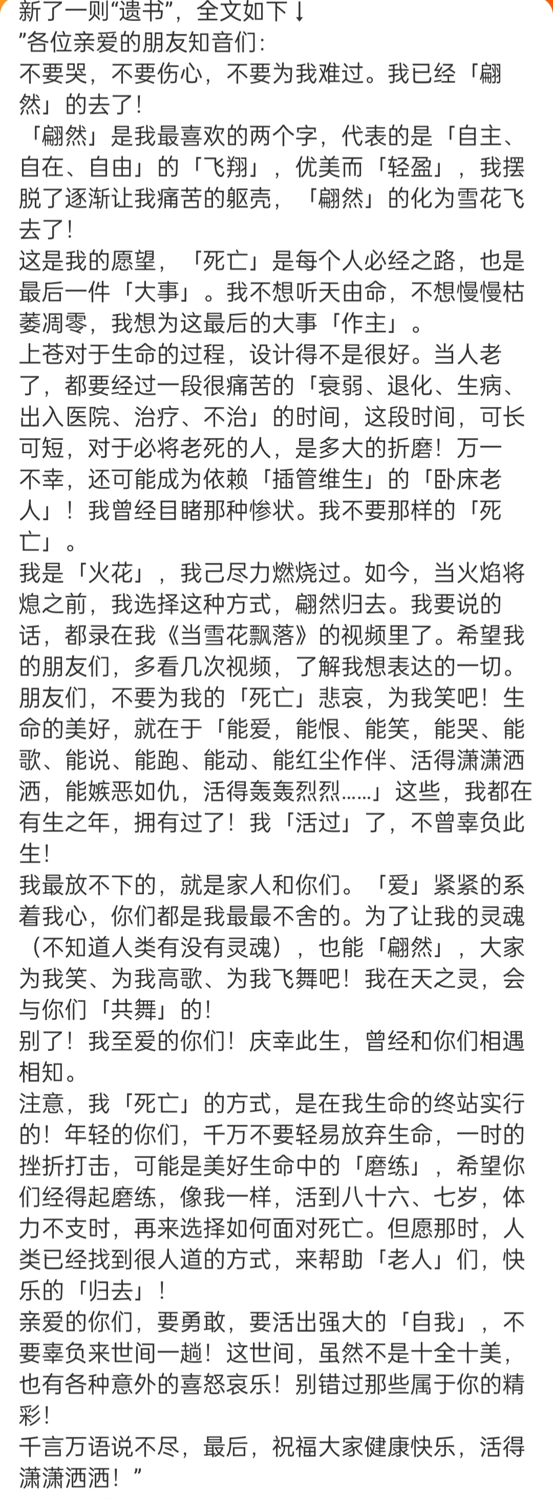 琼瑶劝年轻人不要轻易放弃生命 今天下午1点22分许,琼瑶在家轻生去世,享年86岁。她留下遗书,“我不想听天由命,不想慢慢枯萎凋零,我想为这最后的大事「作主」”,说上苍对于生命的过程,设计得不是很好,不想经历痛苦的惨状。选择轻生是在生命的终站实行的,“年轻的你们,千万不要轻易放弃生命,一时的挫折打击,可能是美好生命中的「磨练」,希望你们经得起磨练,像我一样,活到八十六、七岁,体力不支时,再来选择如何面对死亡。但愿那时,人类已经找到很人道的方式,来帮助「老人」们,快乐的「归去」!”
