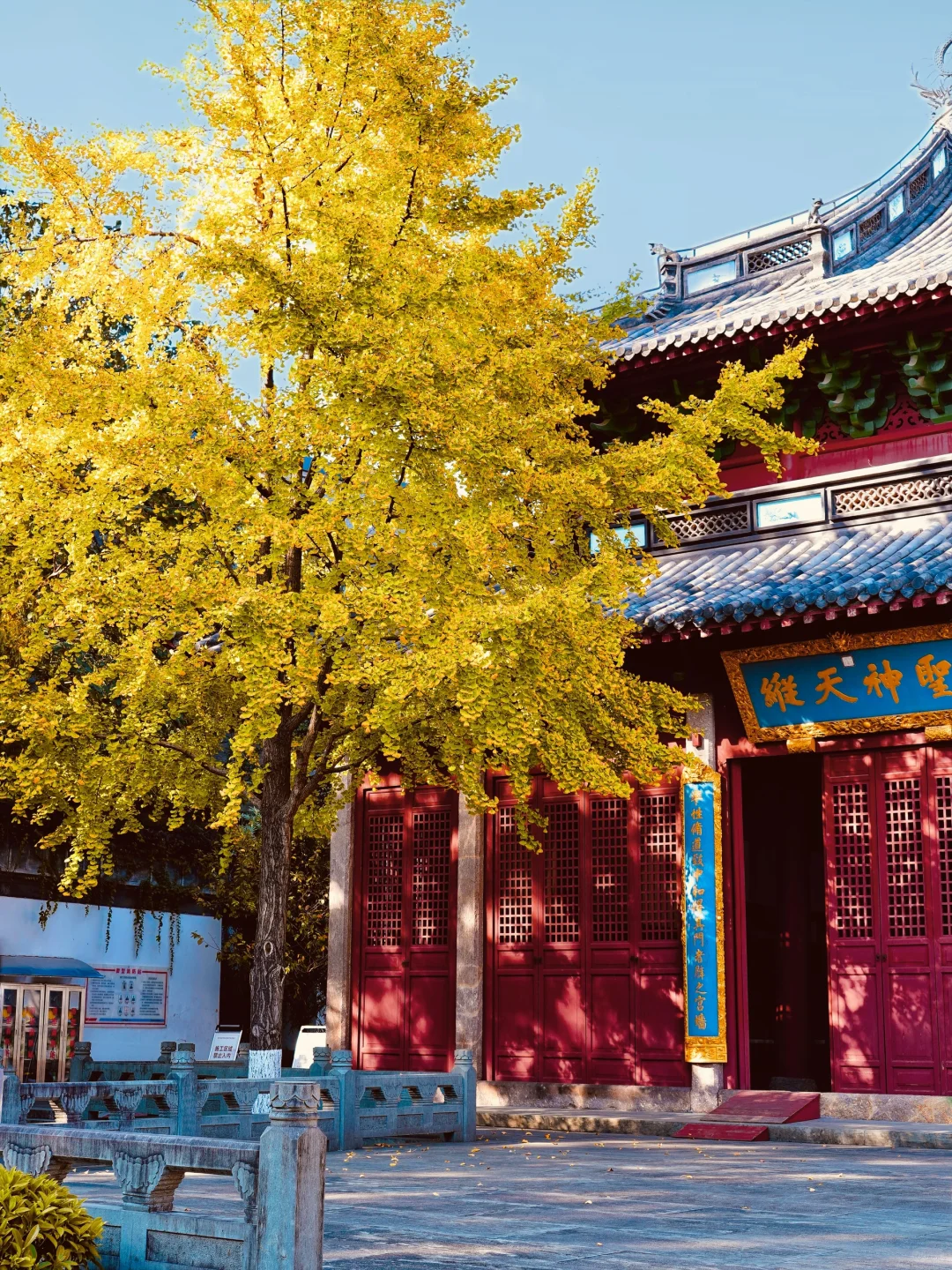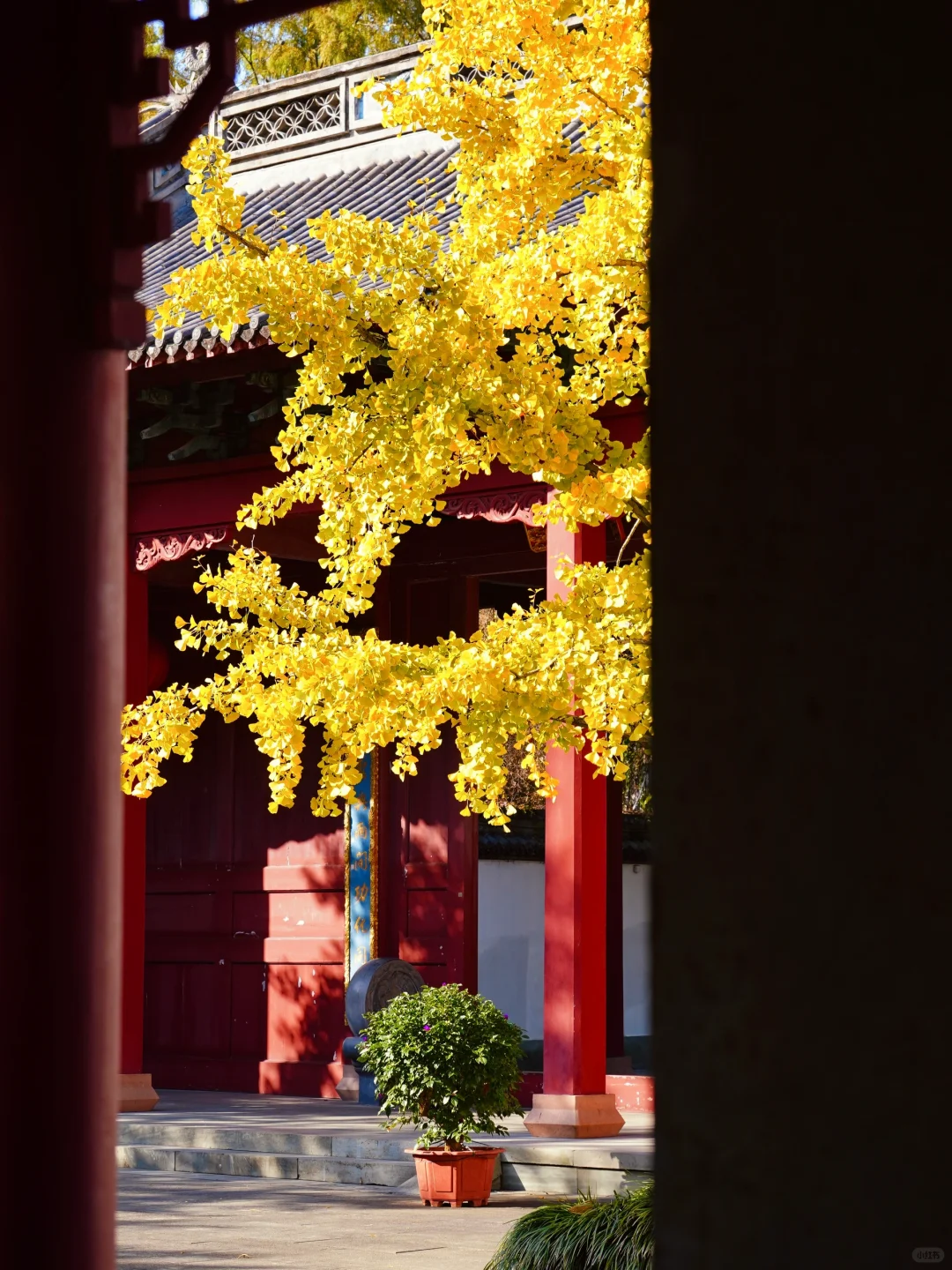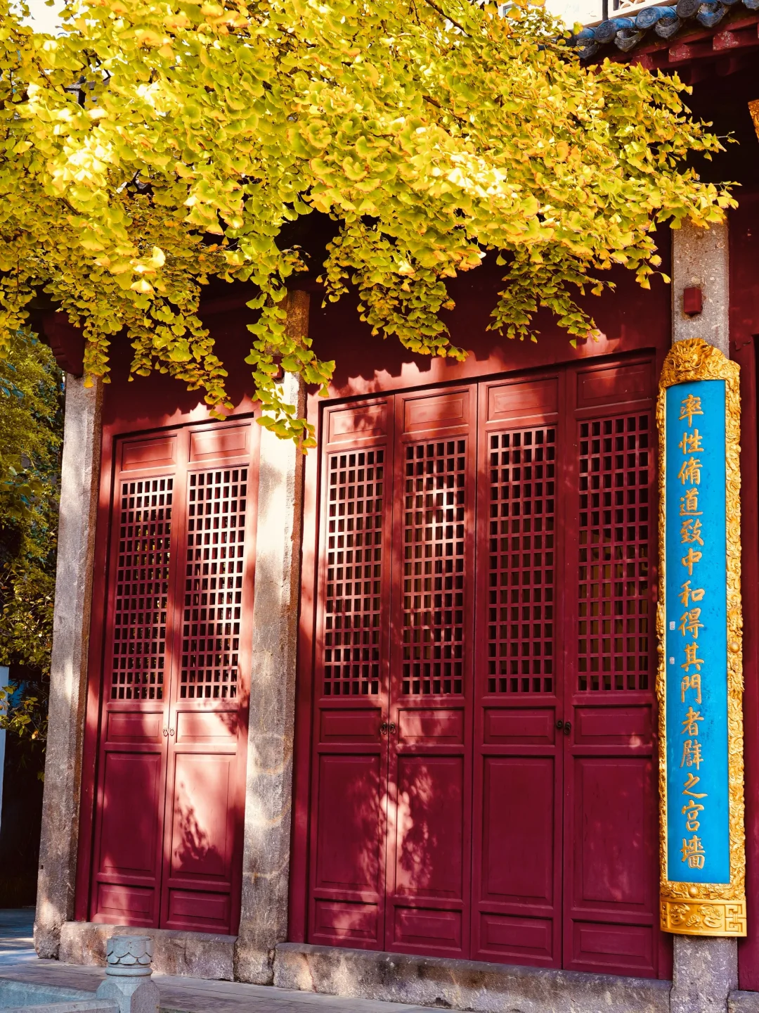 朱红色的殿门配上金黄的银杏,阳光下光影斑驳特别美,仿佛走进了故宫。