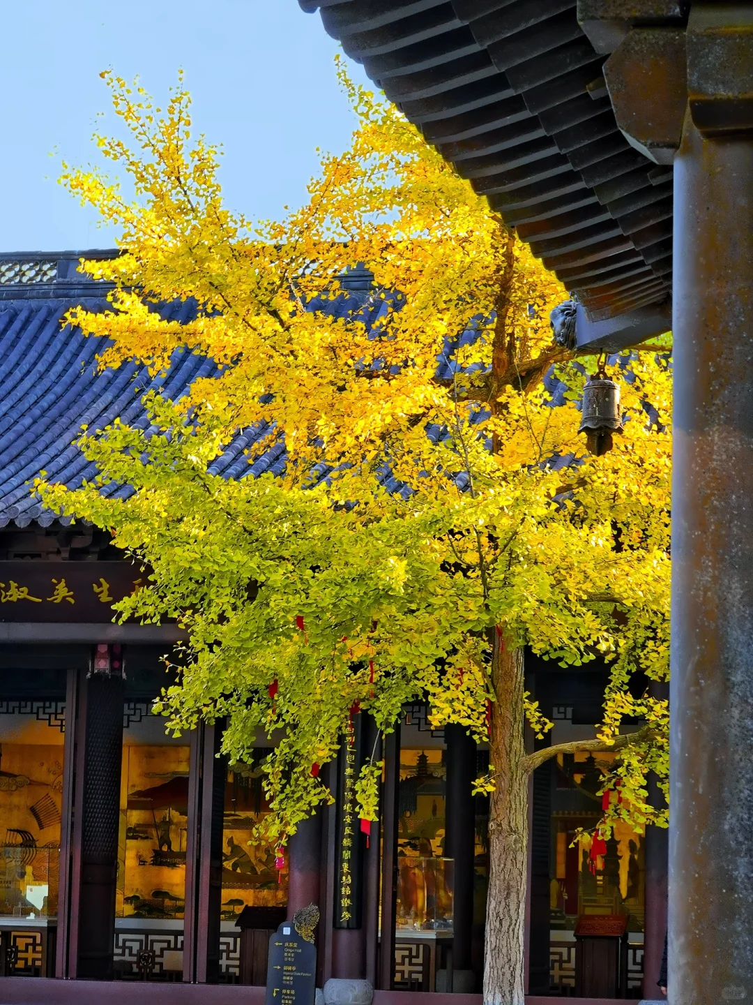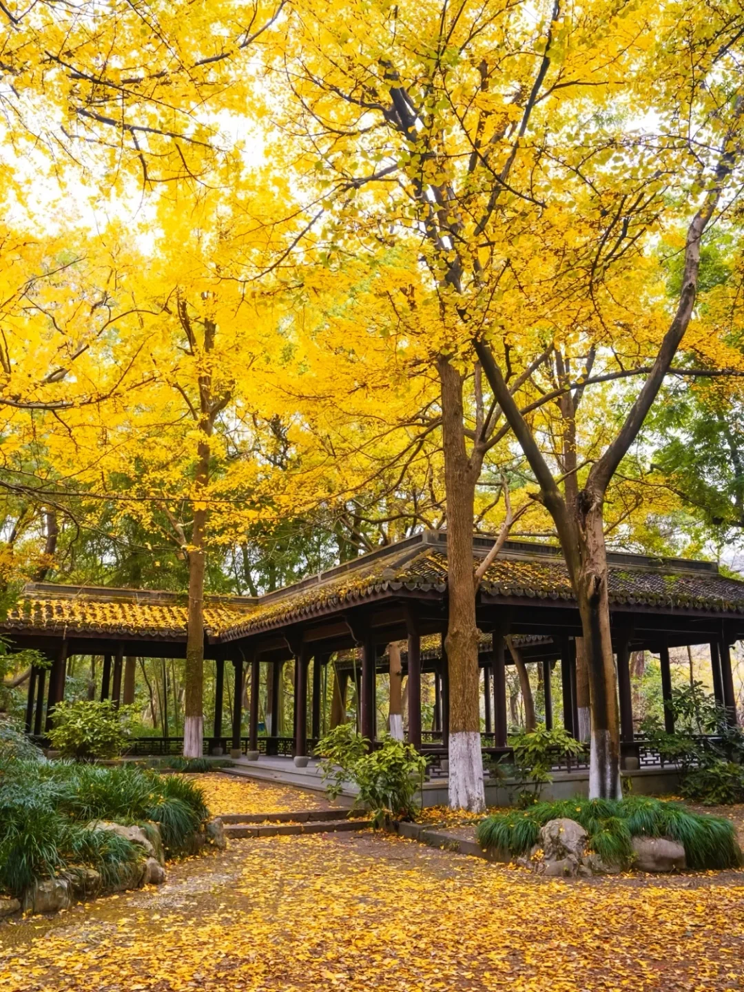 就在孤山公园里,银杏叶落满庭院,阳光洒落在屋檐上,秋日氛围感拉满。