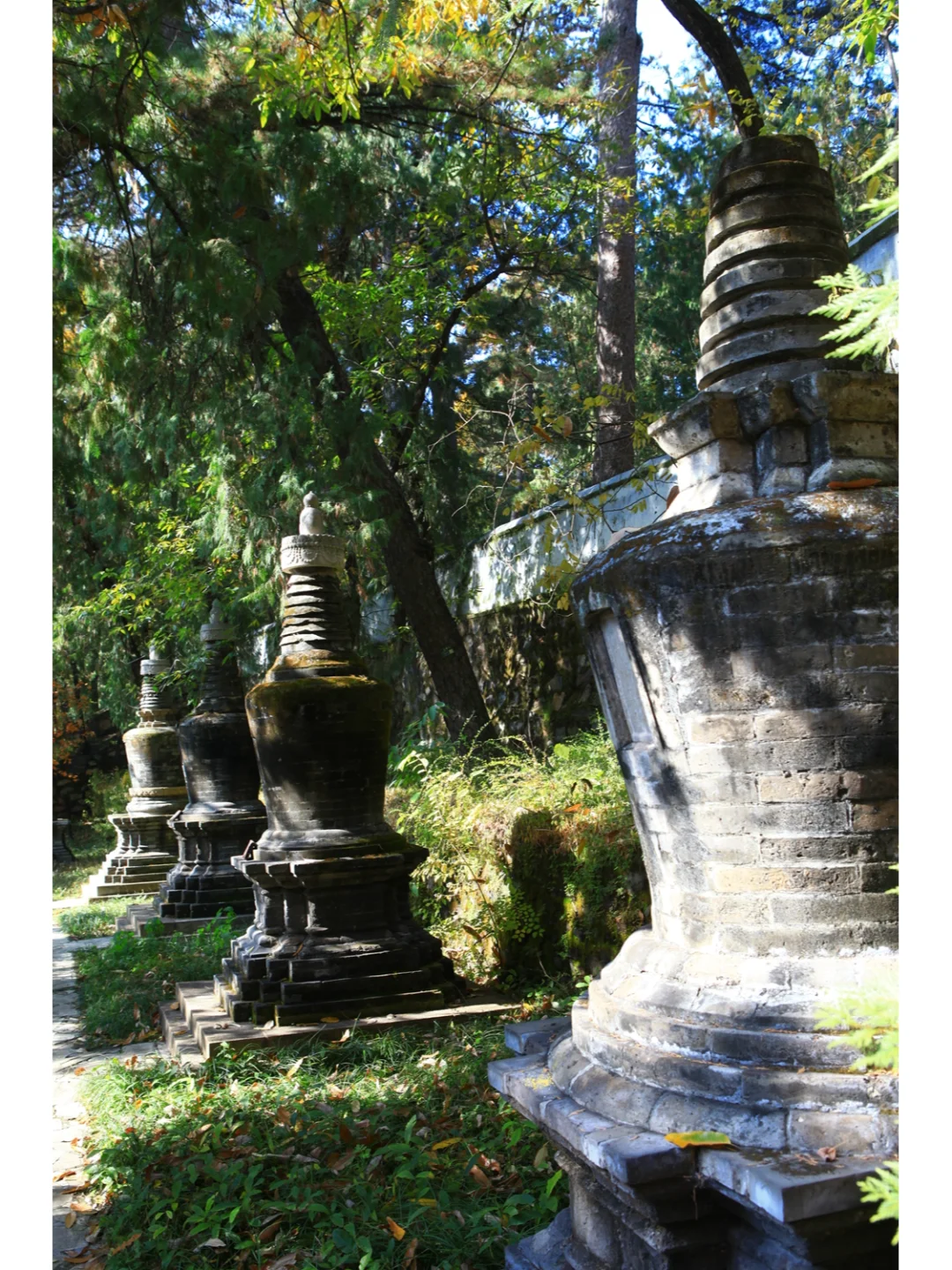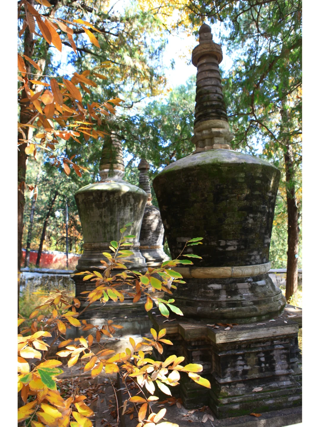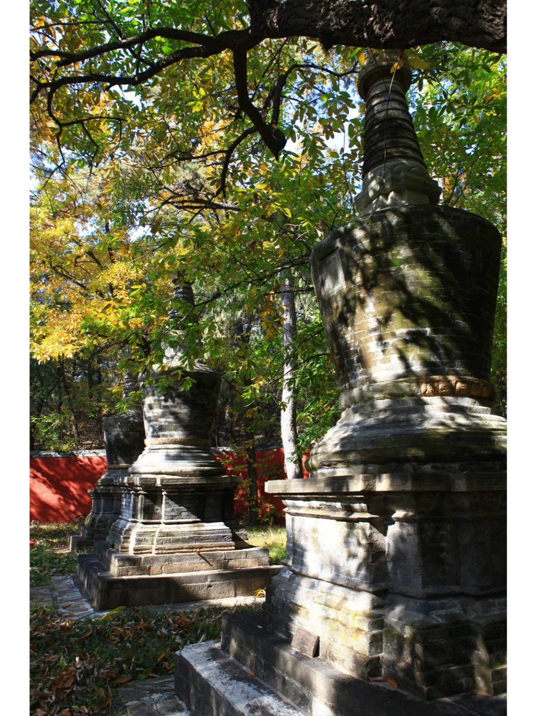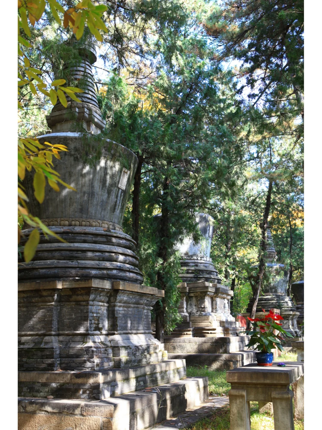 潭柘寺塔林历经了十多个朝代,规模宏大,曾有难以数计的僧人在这里修行,并终老于此,因而在寺院附近留下了数量众多的僧人墓塔。如今在寺前的塔林内完好的保存着形式多样的历代佛塔七十余座。顺着边上的步道上去,就能看见掩映在丛林中的各式古塔,错落有致。这些上下塔林的形成,集结个每个朝代不同的造塔风格。有石经幢式塔,方形单层浮屠式塔,密檐式砖塔,金代公长老塔,元代妙严大师塔和覆钵形藏式石塔等组成。 古塔 塔林 潭柘寺
