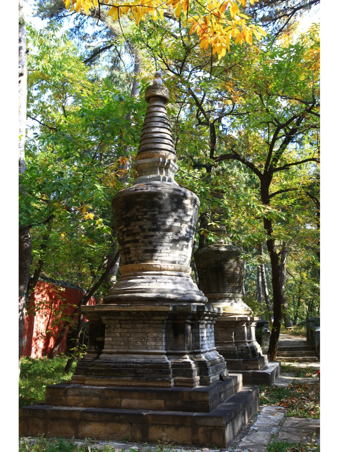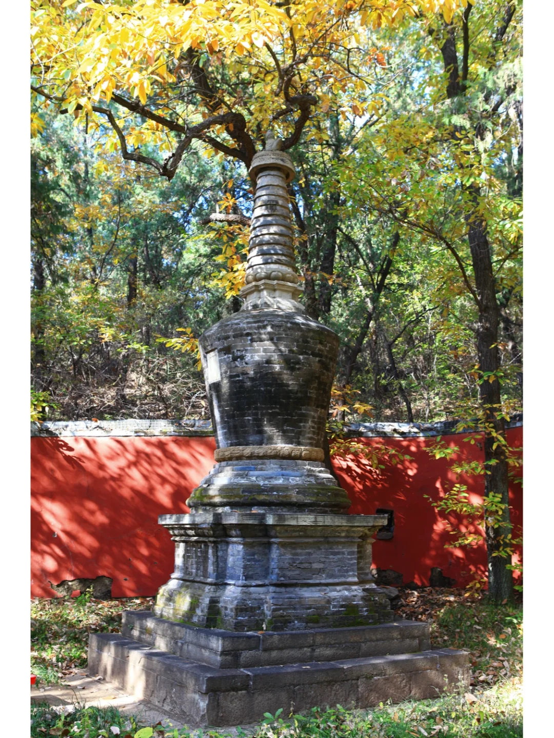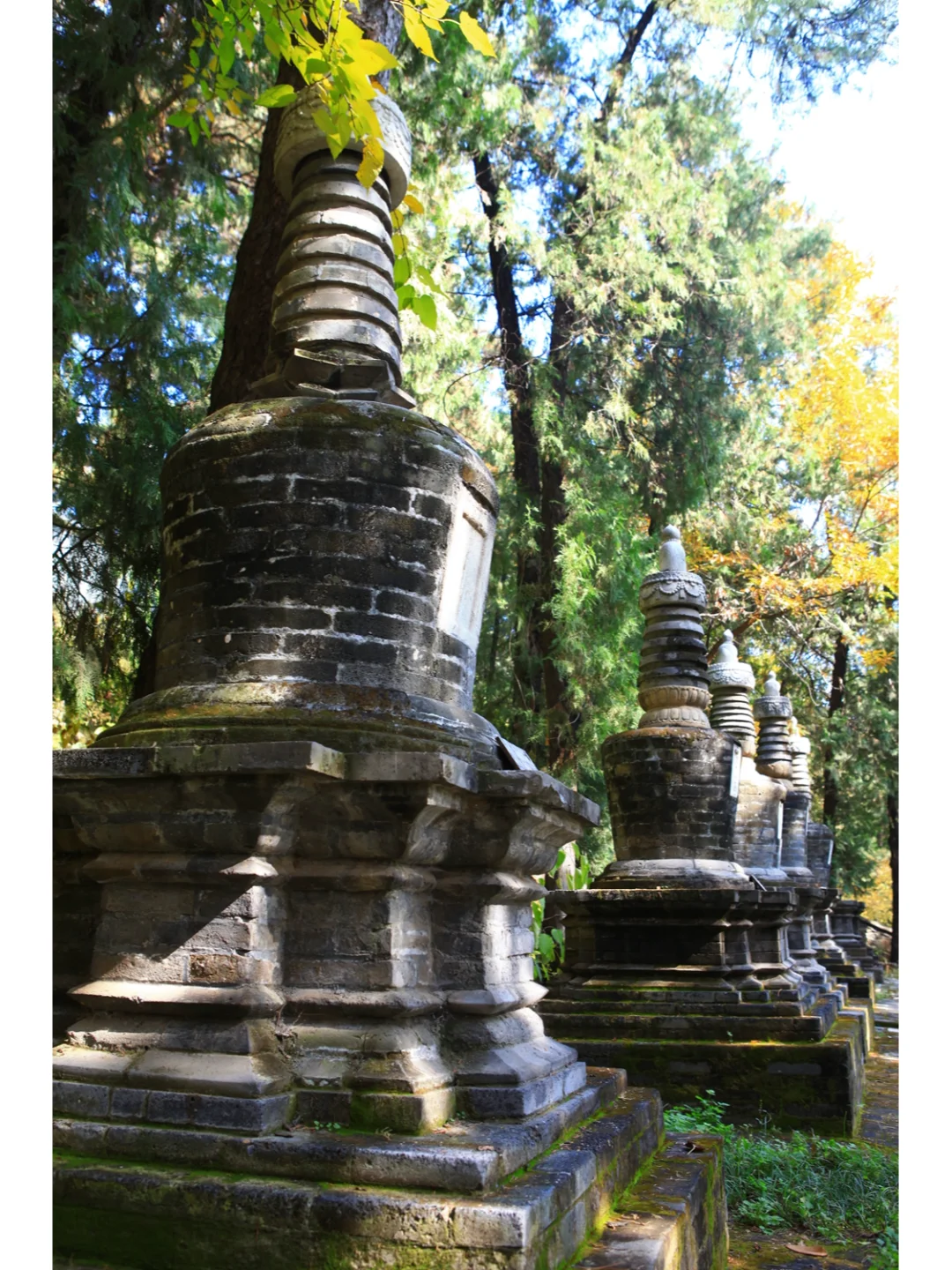 潭柘寺塔林历经了十多个朝代,规模宏大,曾有难以数计的僧人在这里修行,并终老于此,因而在寺院附近留下了数量众多的僧人墓塔。如今在寺前的塔林内完好的保存着形式多样的历代佛塔七十余座。顺着边上的步道上去,就能看见掩映在丛林中的各式古塔,错落有致。这些上下塔林的形成,集结个每个朝代不同的造塔风格。有石经幢式塔,方形单层浮屠式塔,密檐式砖塔,金代公长老塔,元代妙严大师塔和覆钵形藏式石塔等组成。 古塔 塔林 潭柘寺