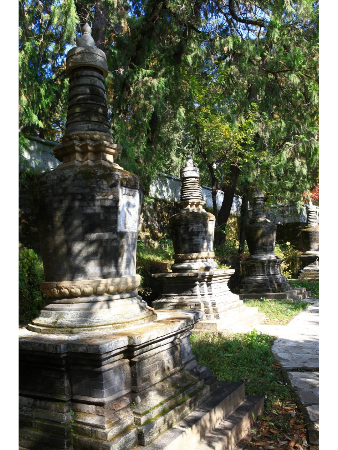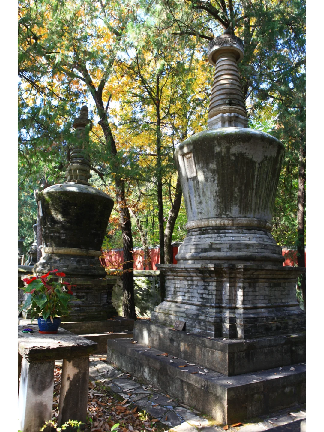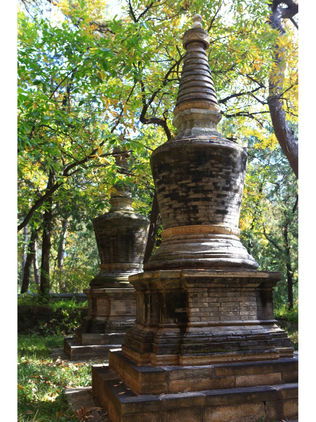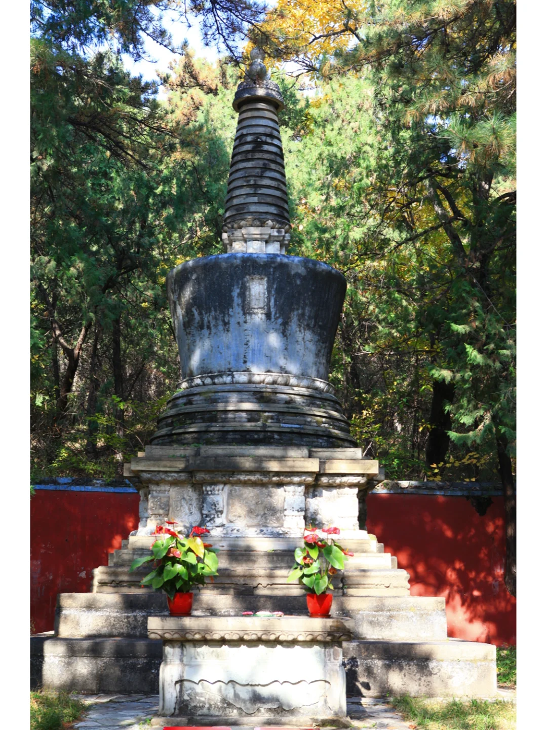 潭柘寺塔林历经了十多个朝代,规模宏大,曾有难以数计的僧人在这里修行,并终老于此,因而在寺院附近留下了数量众多的僧人墓塔。如今在寺前的塔林内完好的保存着形式多样的历代佛塔七十余座。顺着边上的步道上去,就能看见掩映在丛林中的各式古塔,错落有致。这些上下塔林的形成,集结个每个朝代不同的造塔风格。有石经幢式塔,方形单层浮屠式塔,密檐式砖塔,金代公长老塔,元代妙严大师塔和覆钵形藏式石塔等组成。 古塔 塔林 潭柘寺