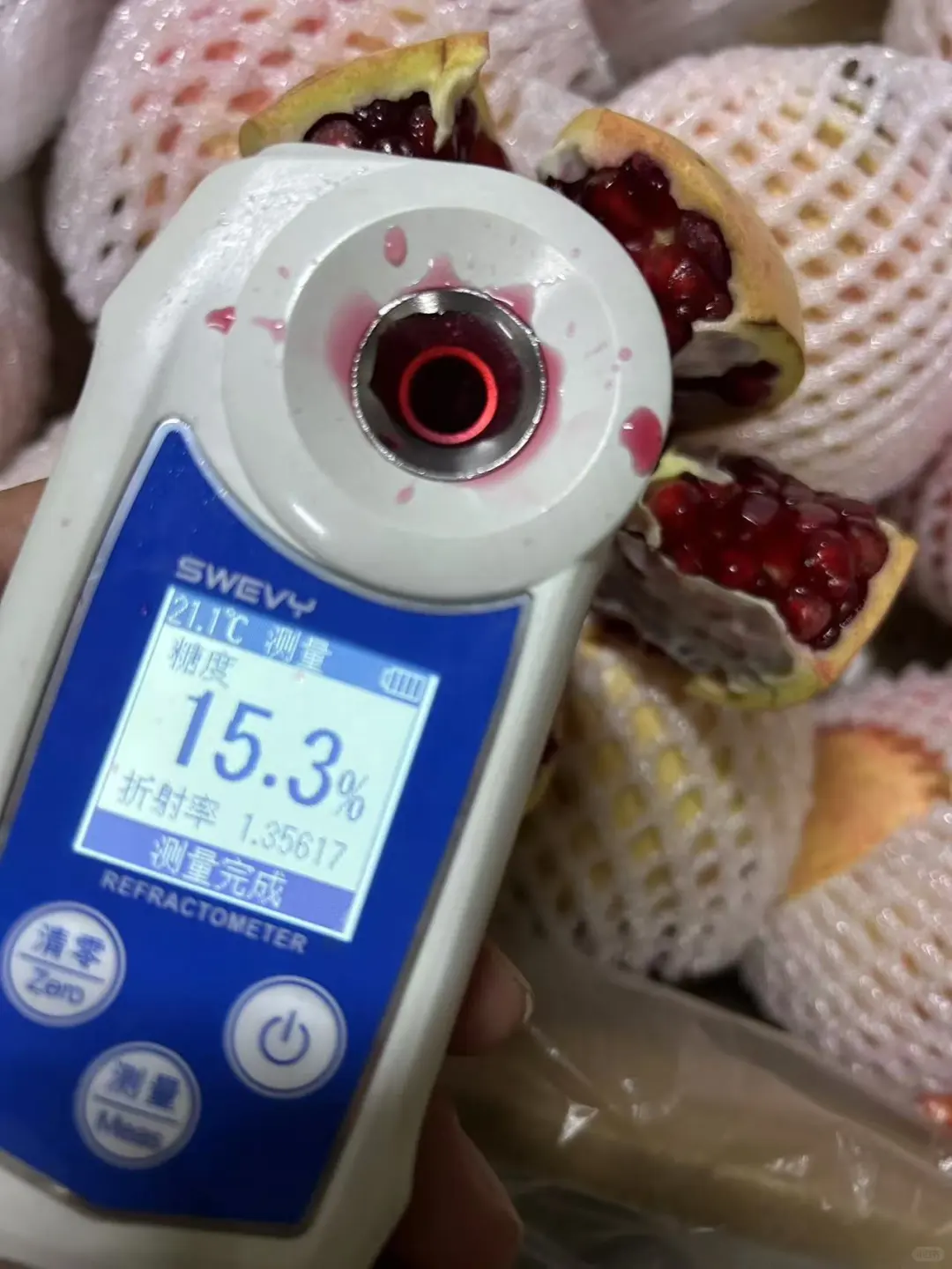 原本只是随意逛逛水果店,没抱什么期待,结果看到一箱包装精美的软籽石榴,3.5公斤/箱只要28迪拉姆。价格实在太低,贪便宜的心情全款拿下!心里还是有点怀疑:会不会不好吃?老板看出我的顾虑,于是给我看了他测糖仪的照片。立刻马上拎了一箱,果然每一颗都甜得发亮。