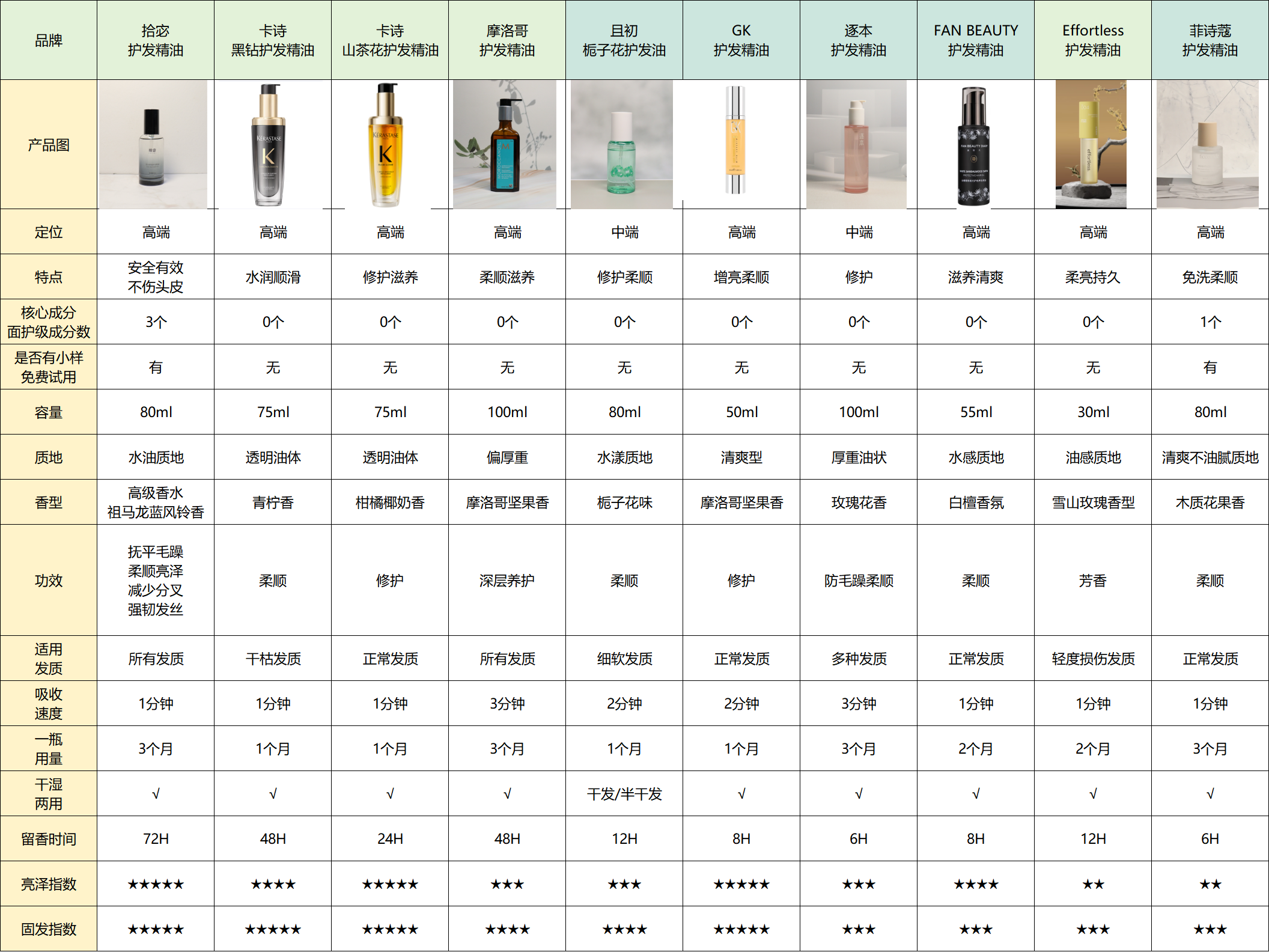 接下来,我们来看看这些护发精油产品的具体数据,通过这些详细信息,大家可以清晰地评估它们的实际效果,也能比较不同品牌的差异,从而做出理性的选择。