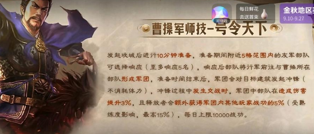 曹操这个军师技,相当于攻城现场的军团集结功能,前期攻城必用了,很多玩家部队怕攻城时被吃克制,所以可以通过临时集结,通过号令天下5支部队一起攻城。友军部队可选择响应,还是要人工手动点确定才行,很多不按时攻城的部队,还是不能参与,这是缺陷,如果自动集结,那实用指数翻倍提高。就是跟刘备一样蹭战功的,以后开战估计先开曹操buff,集结周围五支部队组成军团,然后鼓舞,再上刘备buff,猛的一匹,冲九八防克制。