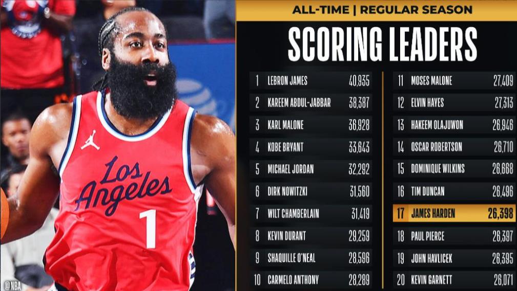 本场比赛之前,哈登职业生涯的总得分是26376分,排名历史第19的位置。而他今天砍下了23分,也让他在历史得分榜上前进了2位。在哈登之前的,是哈夫利切克和皮尔斯,两位都是名人堂球员。哈夫利切克生涯砍下了26395分,皮尔斯职业生涯则是砍下了26397分。不过此役过后,哈登职业生涯的总得分来到了26399分,他超越皮尔斯,来到了历史得分榜第17的位置。