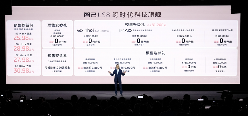 3 月 26 日,定位跨时代科技旗舰的中大型 SUV 智己 LS8 正式开启预售,新车提供大五座与大六座两种实用布局,预售权益价仅 25.98 万元至 30.98 万元,以极具冲击力的定价杀入主流高端市场,直接把百万级配置拉到 30 万价位段。