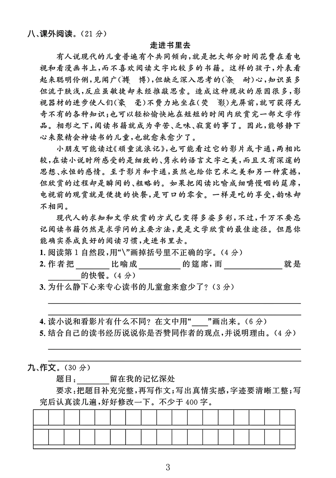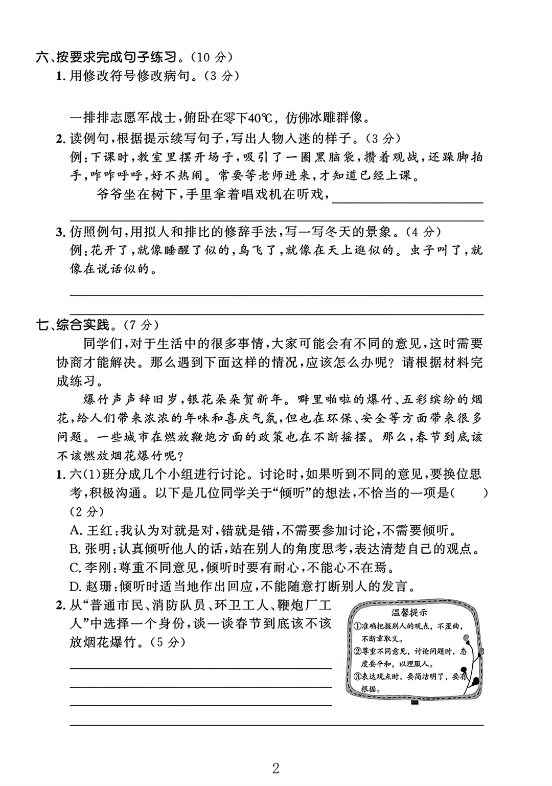 人教版 六年级上册语文 期末考试 期末试卷 期末 试卷 电子版可打印