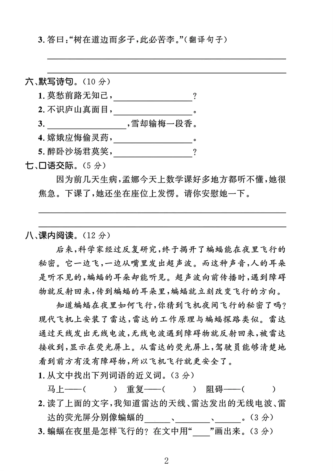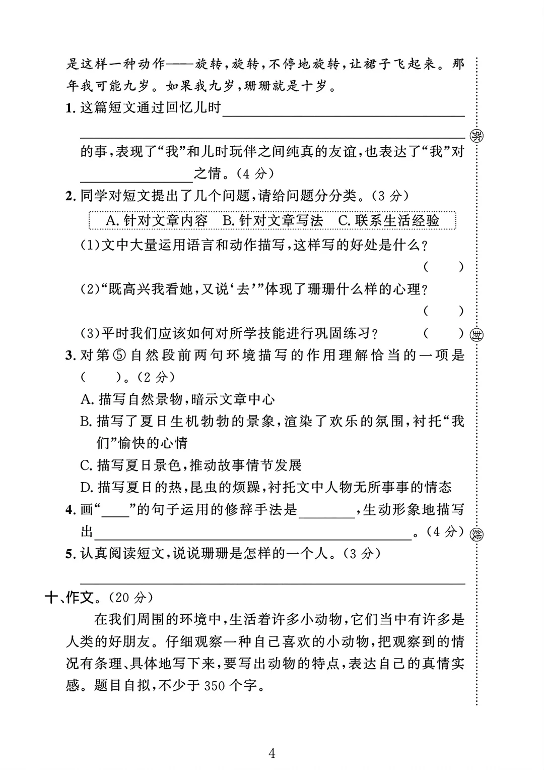 人教版 四年级上册语文 期末 期末考试 期末试卷 试卷 电子版可打印