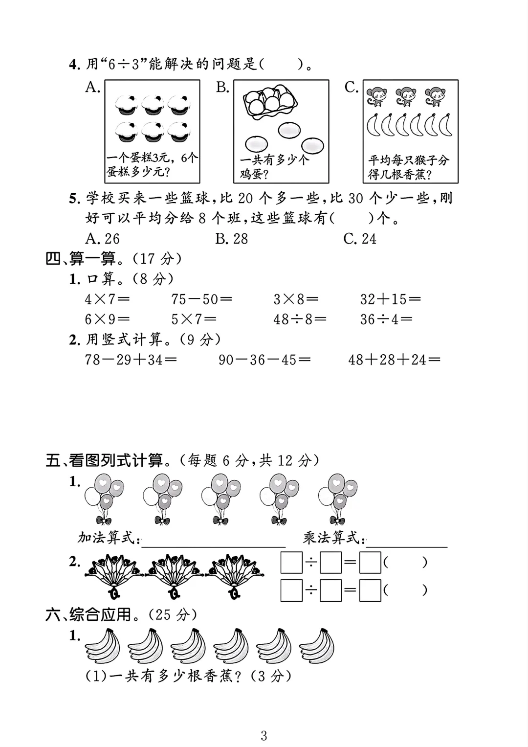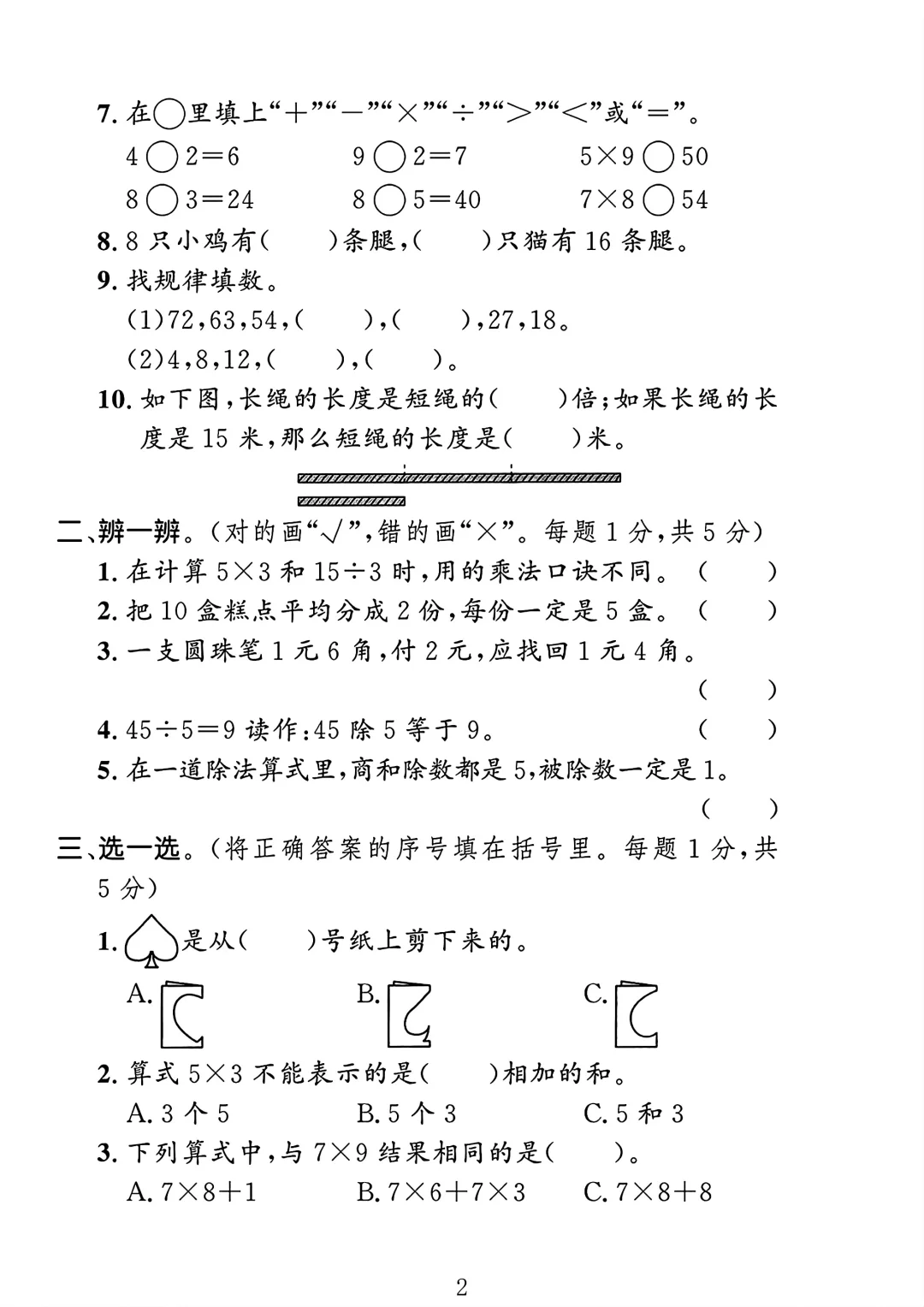 北师大版数学 二年级上册数学 期末 试卷 期末考试 期末试卷 电子版可打印