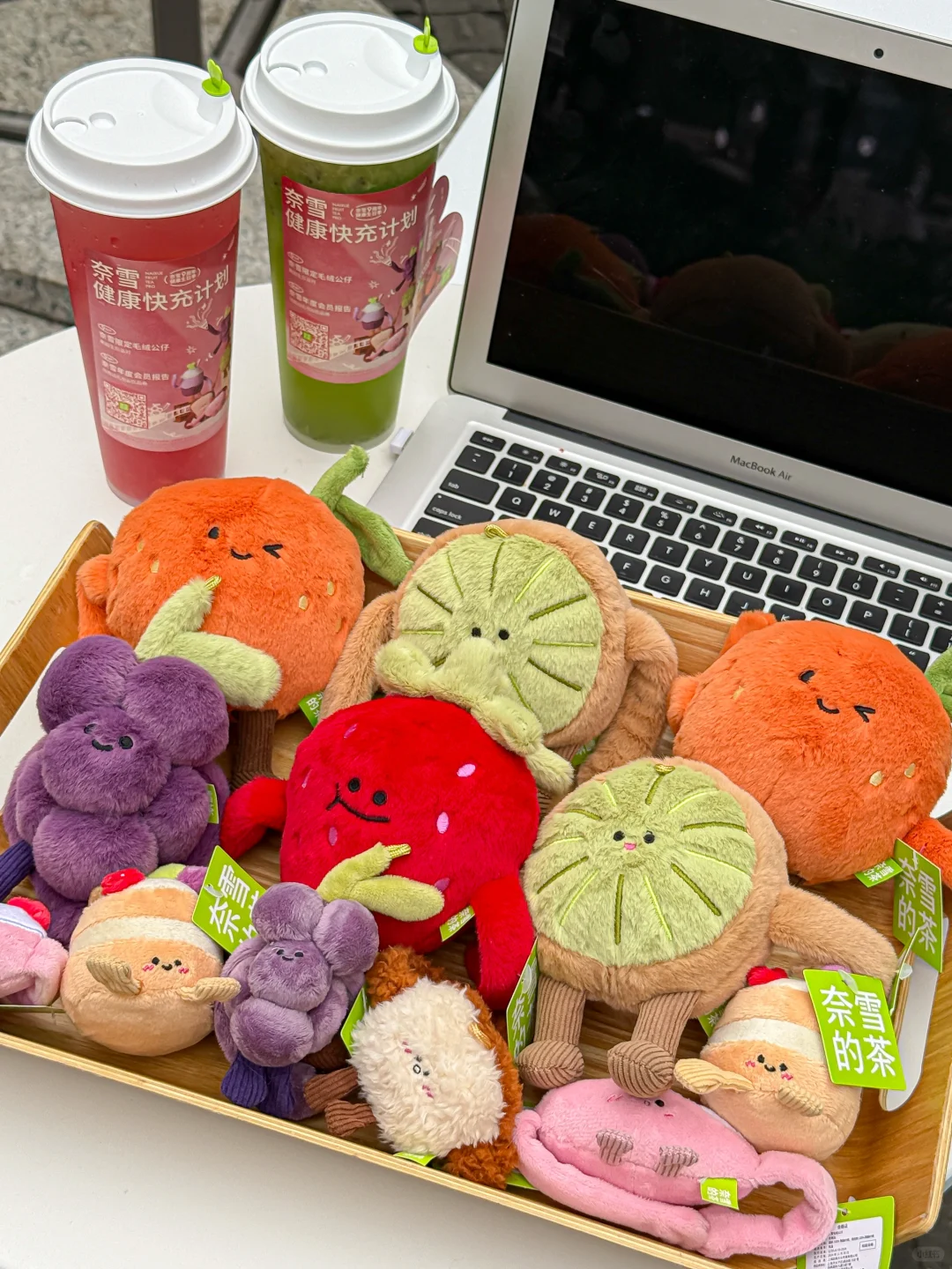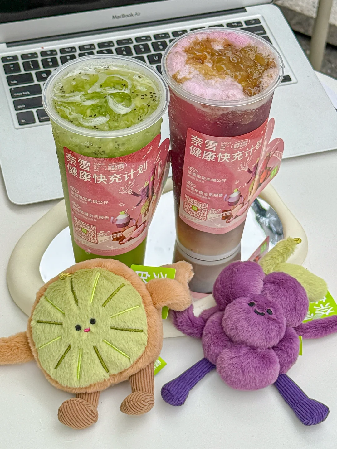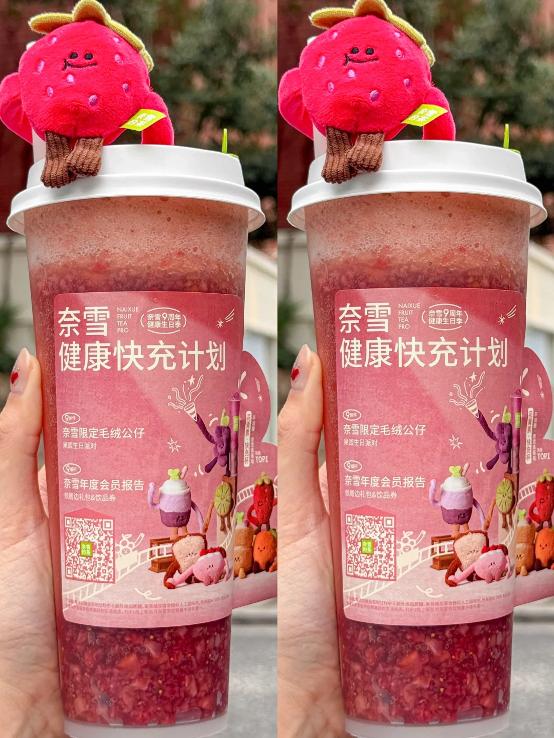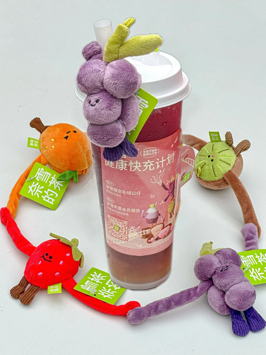 不敢想象拥有全套玩偶我会是多开心的小女孩!!🥹 奈雪 9 周年·健康生日季的毛绒抱抱公仔真的太太太可爱!! 一共8款!每款都有两种大小!! 真的出到我的心趴!!情绪价值拉满了!😭 敲爱不加糖·花青素杯!【不加糖·奈雪黑葡萄】 果肉多还很健康!太适合打工人了!! 快-