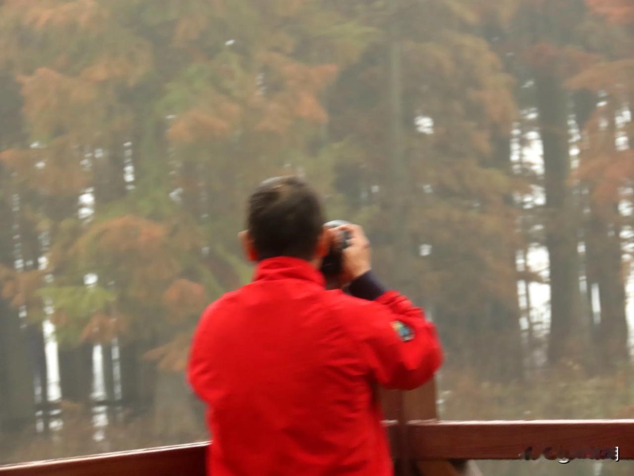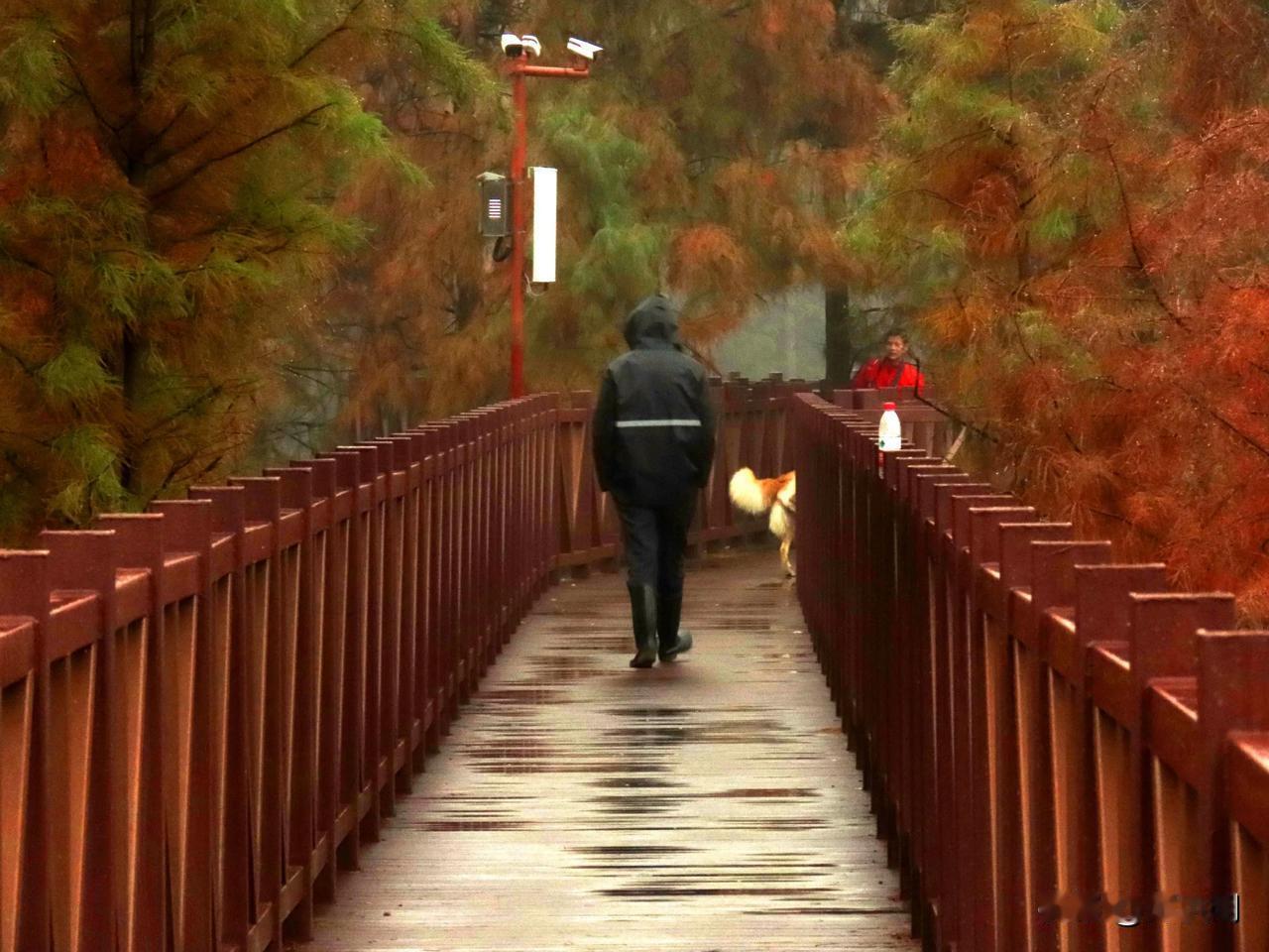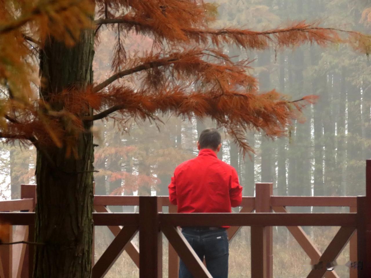 冬日漫步,红衣背影与红杉叶相映成趣。 四明湖湿地公园