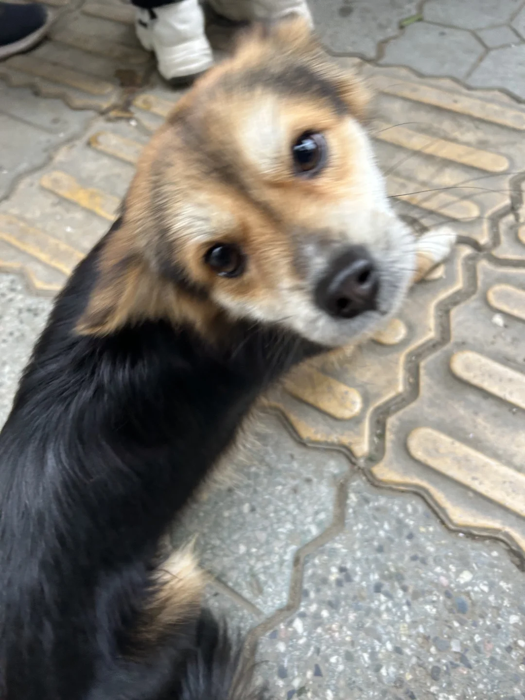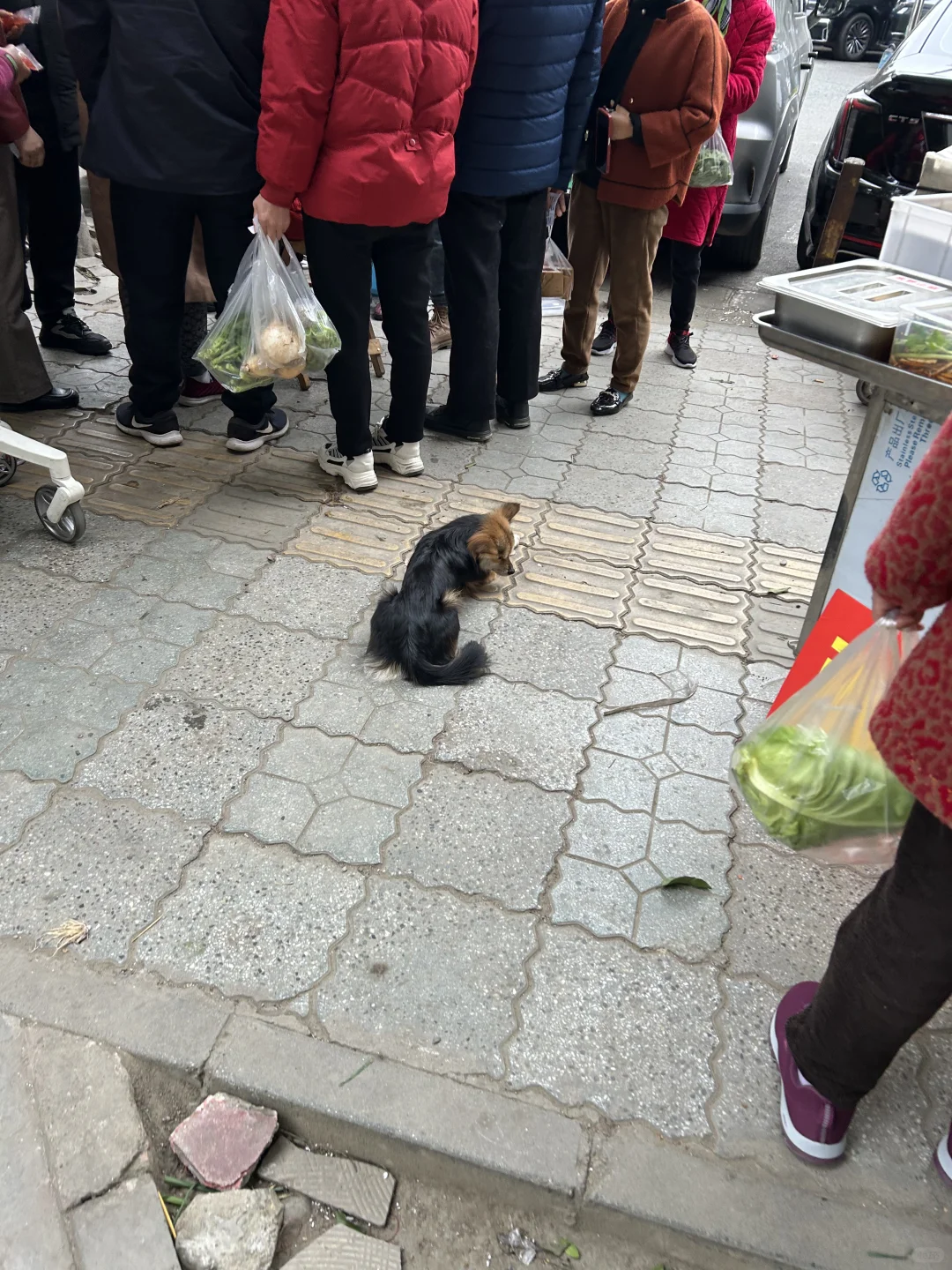 女友今早去早市散步看到了小黑,他趴在一个被围的水泄不通的摊位外侧。女朋友叫他几声,他回头看着女友,晃了几下尾巴,但是不过来。