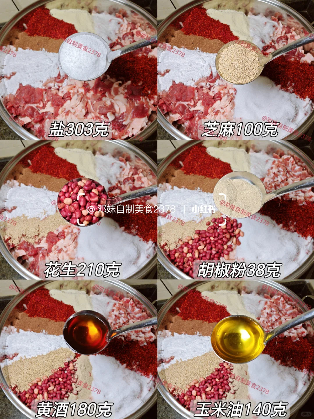 天气冷了,灌香肠的时间又来了~ 香肠在家自己灌,巨好吃😋 孩子直夸赞味道绝绝子👍 直接吃,下饭,下面条都可以~ ——❄️❄️—————————— 【麻辣香肠的配料表】: 1⃣️猪肉(含脆骨300克)2⃣️花椒粉 3⃣️胡椒粉 4⃣️冰糖粉 5⃣️鸡精 6⃣️味精 7⃣️玉米油 8⃣️黄酒 9⃣️鸡蛋 🔟花生米 1⃣️1⃣️芝麻 1⃣️2⃣️盐 1⃣️3⃣️辣椒粉 👉用量请看图片教程 ——🔴🔴—————————— ✅抓拌均匀腌制5小时左右再拌匀。 ✅脆骨切颗粒状。 ✅猪肉🥩用夹子肉。 ✅酒用黄酒。 ———————————— 邓妹tips: 💡香肠在家做干净又卫生, 大人小孩都爱吃。 💡喜欢吃有嚼劲的就风干时间加长。 牙口不是很好的, 就风干一周即可。 💡家庭版自制川味麻辣香肠 做法简单,赶紧在家安排一下吧。 ………………………………………………………… 腊肉香肠