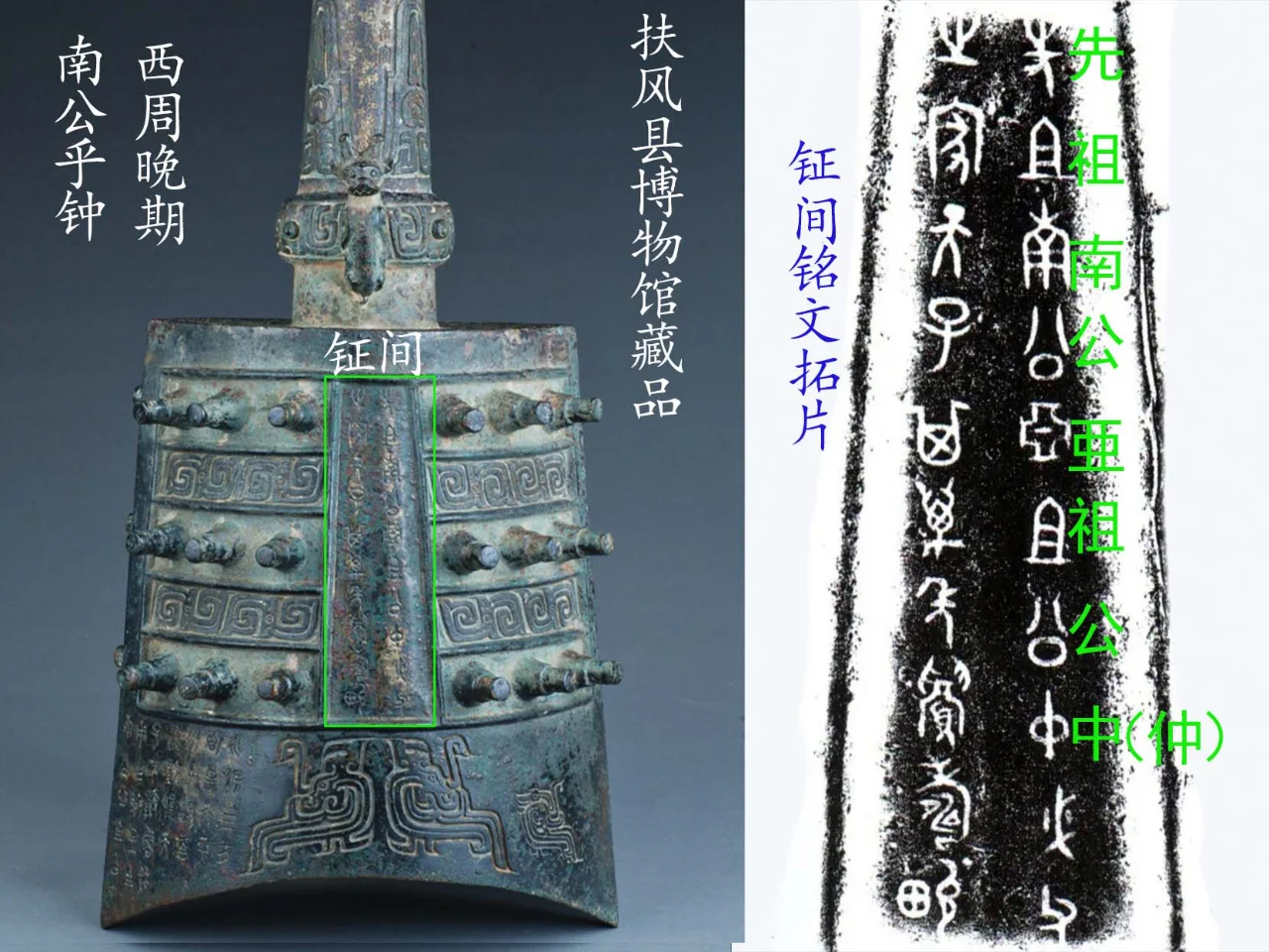 1、钲间铭文:~先祖南公、亚祖公中(仲)~,南宫乎钟,