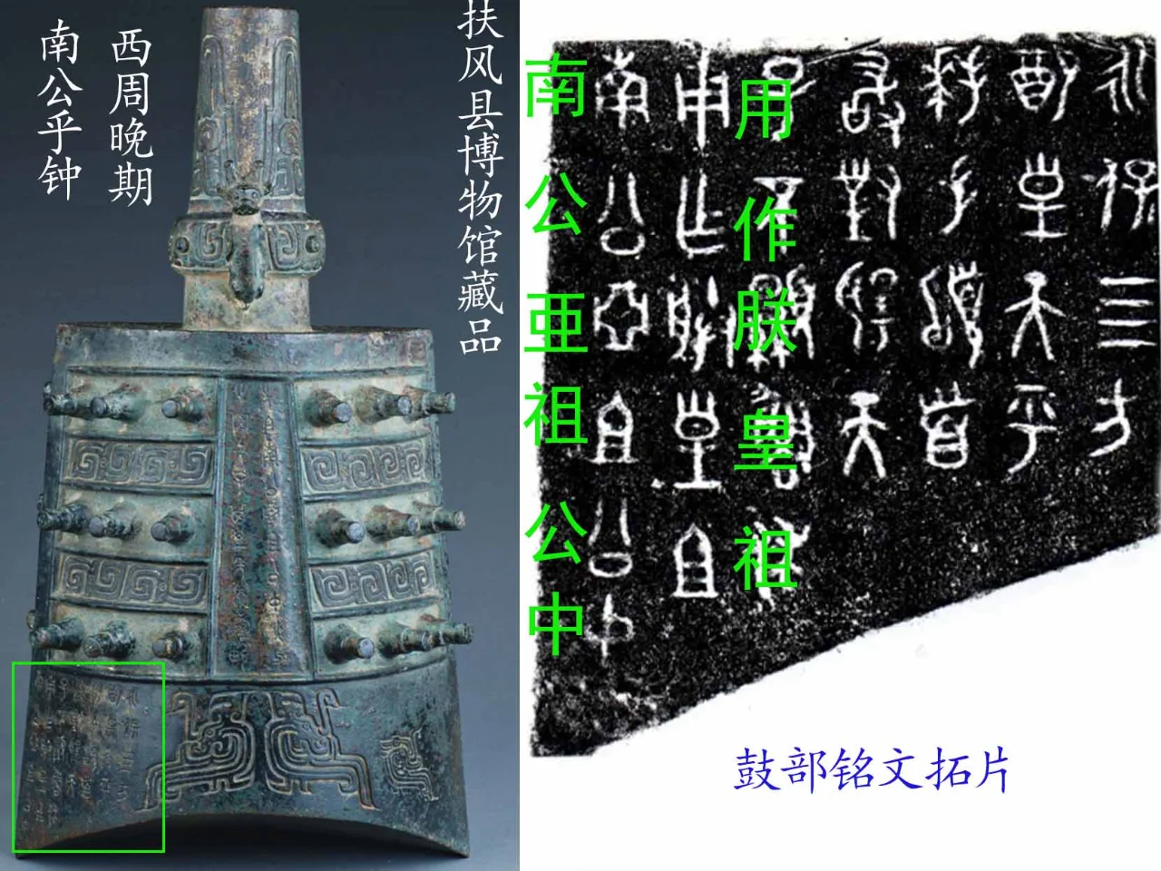 2、鼓部铭文:~用作朕皇祖南公、亚祖公中~(仲)(皇祖,父氏祖)。