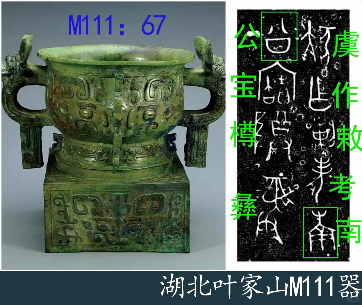 1、叶家山M111方座簋铭文:犺作烈考南公宝樽彝。应隶定为:虞作敕考(老)南公宝樽彝。